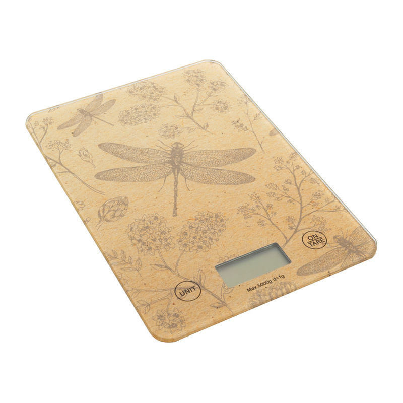Az elegáns, szitakötőkkel mintázott üveg konyhai mérleg minden konyhában kötelező darab. A mérleg 1 × 3V CR2032 lítium elemet tartalmaz. Vanilla Season díszdobozba csomagolva.