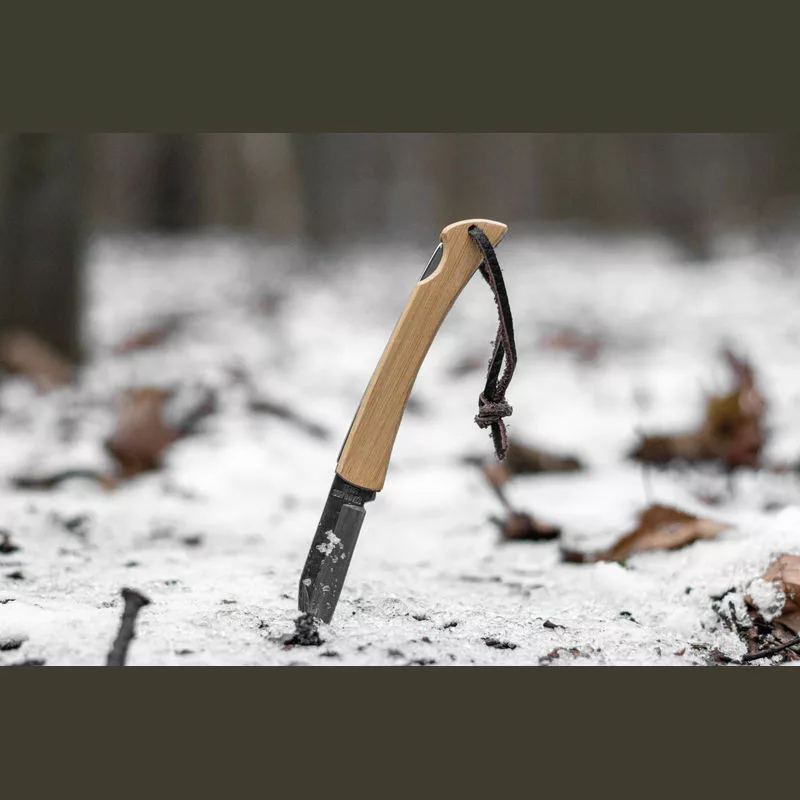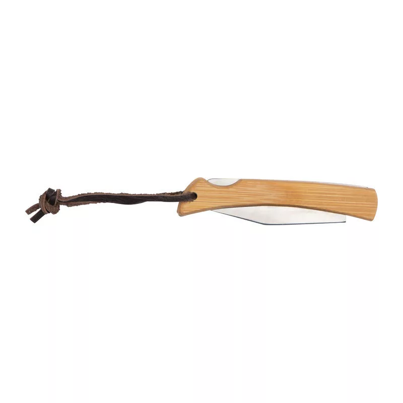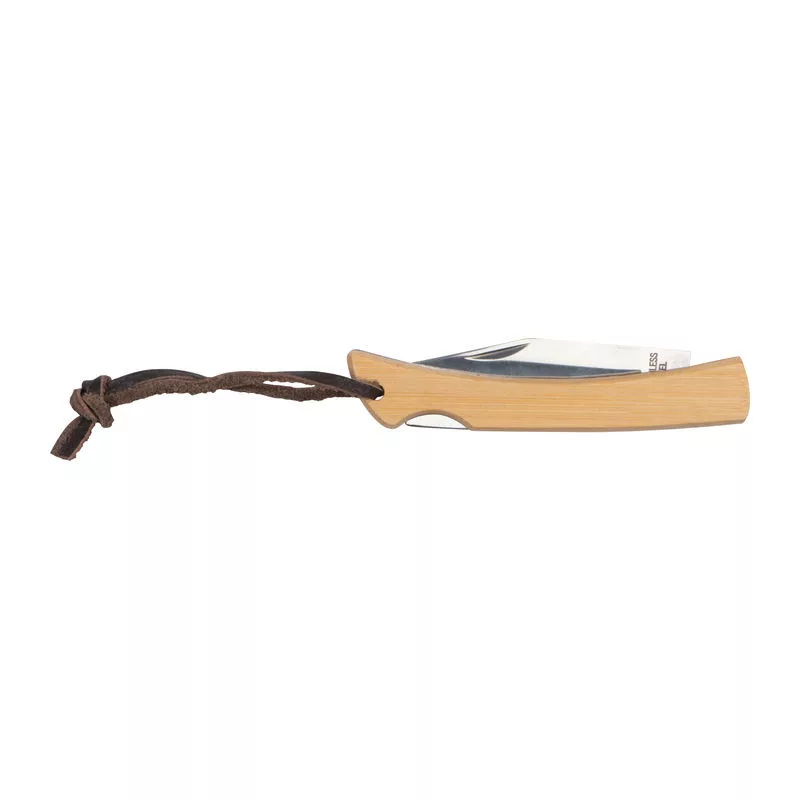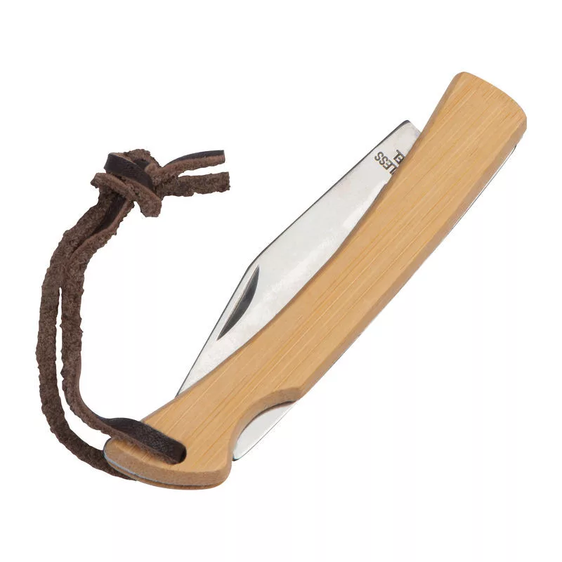 Rozsdamentes acél zsebkés bambusz markolattal, biztonsági zárral és akasztóhurokkal.