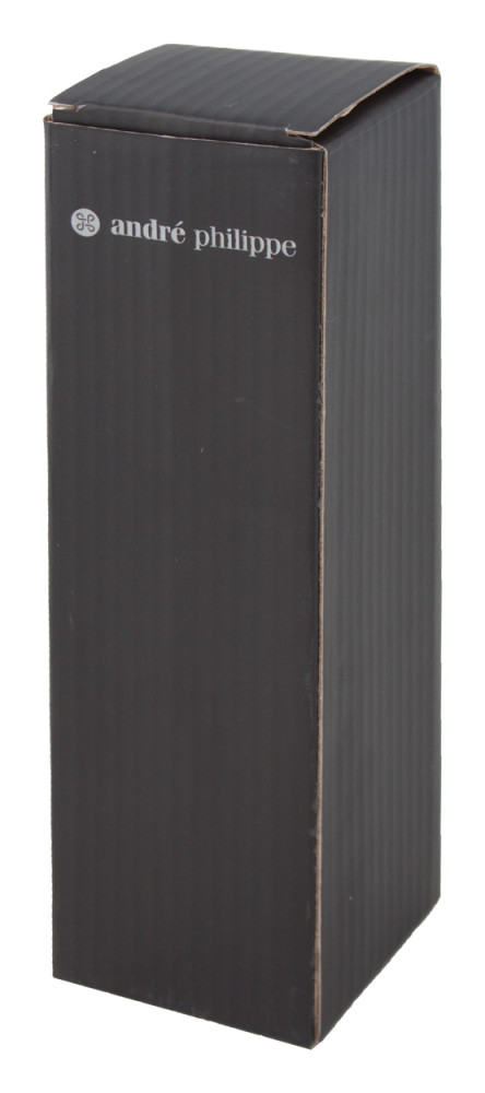 Rozsdamentes acélból készült dupla falú thermo bögre műanyag füllel és ivónyílással a tetején, 330 ml. Fekete karton díszdobozban szállítjuk. André Philippe márkatermék.