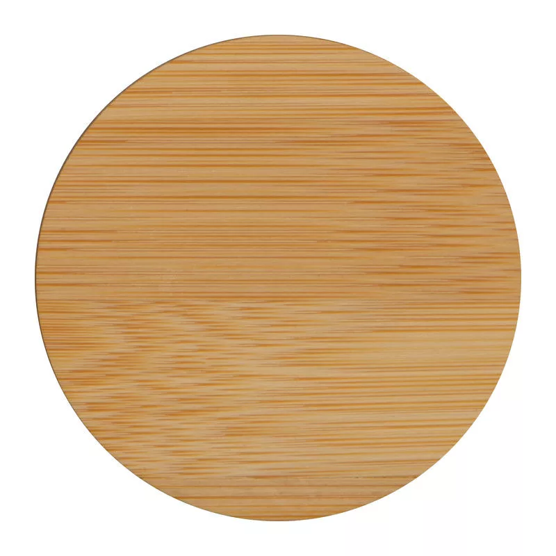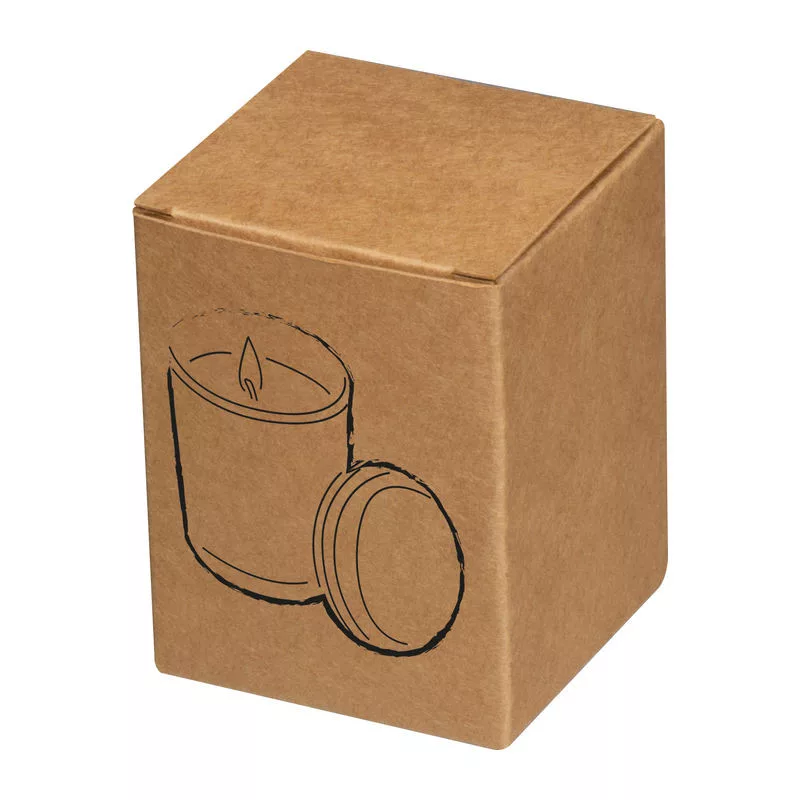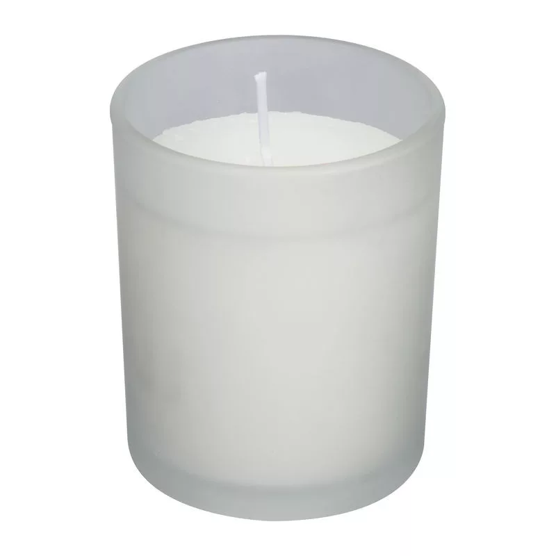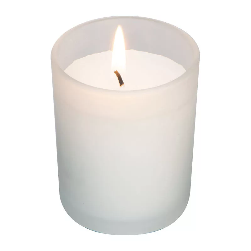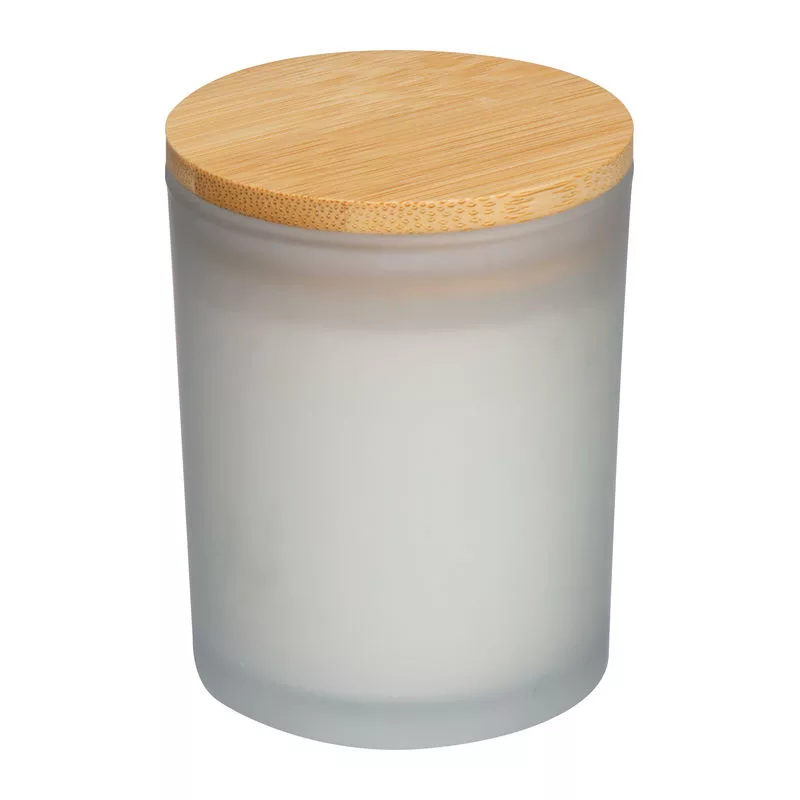 Elegáns gyertya matt üvegben, bambusz fedéllel.