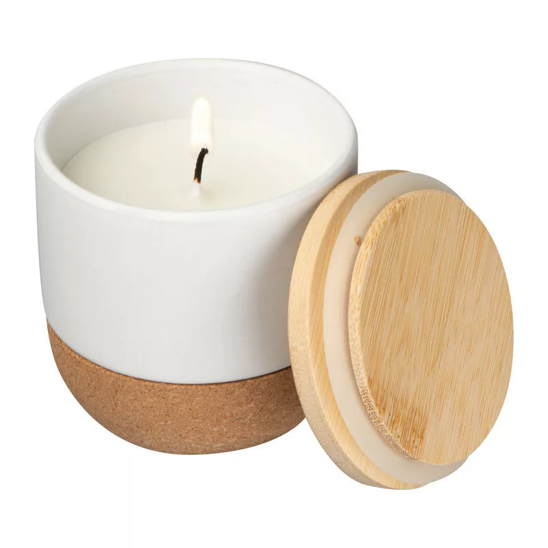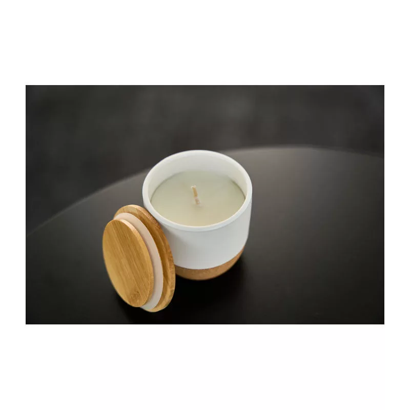 Elegáns gyertya kerámiatalapzaton, parafa aljjal és bambusz fedéllel. Stílusos kiegészítő, mely tökéletes a kellemes hangulathoz.