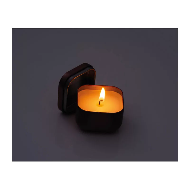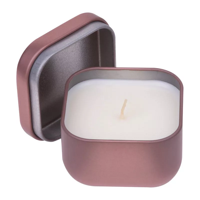 Hangulatos gyertya fém dobozban, amely 60 g viaszt tartalmaz.