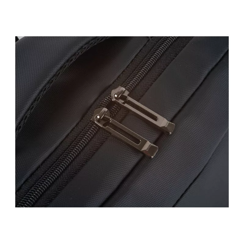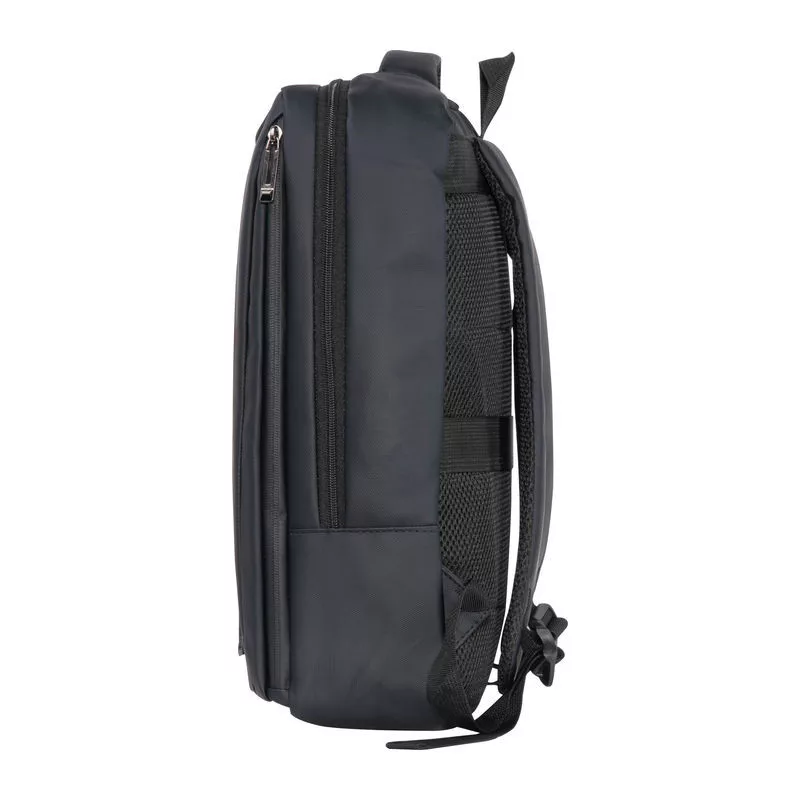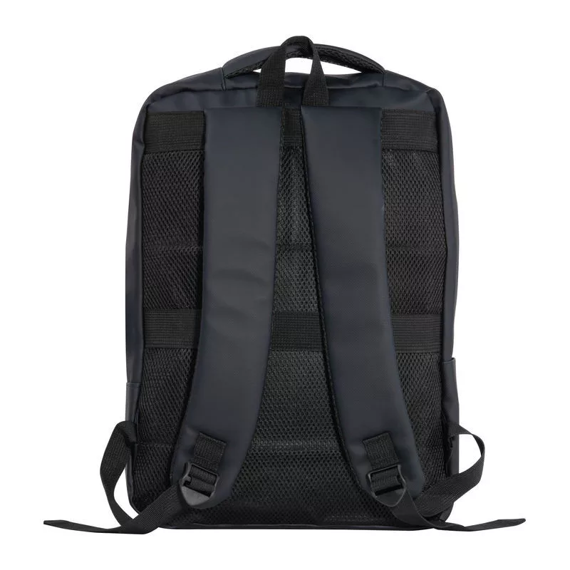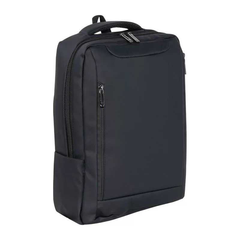 PU anyagból készült laptop hátitáska 15-16 hüvelykes laptopok számára. Két cipzáras első rekesszel, egy nagy párnázott főrekesszel a laptop részére, különféle belső zsebekkel, párnázott vállpántokkal, egy hordozófüllel és a hátoldalán bőröndpánttal rendelkezik, amely segítségével a bőröndre rögzíthető.