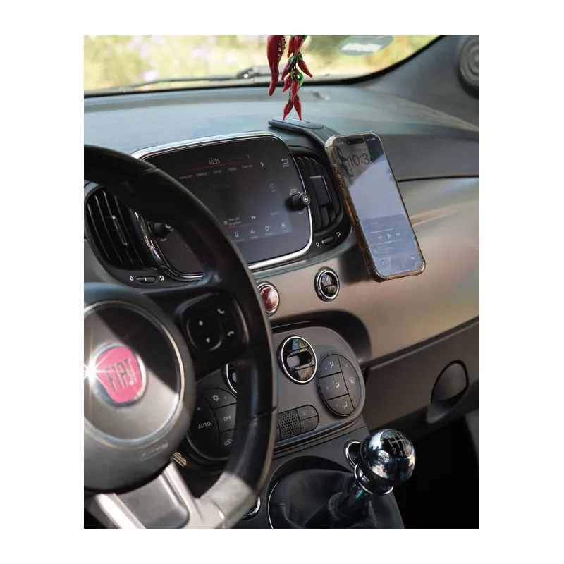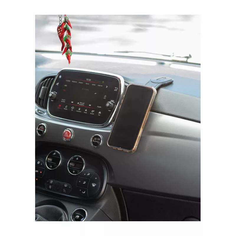 Mágneses mobiltelefon tartó gépjárművekben történő használatra tervezve. A tartó a gépkocsiban bármely kívánt helyre ragasztós matrica segítségével rögzíthető. Az erős tépőzáras rögzítésnek köszönhetően bármikor könnyen eltávolítható. A gyűrűben elhelyezett mágnes biztonságosan rögzíti a kompatibilis okostelefonokat; nem mágneses készülékekhez pedig egy ragasztós mágnesgyűrű tartozik.