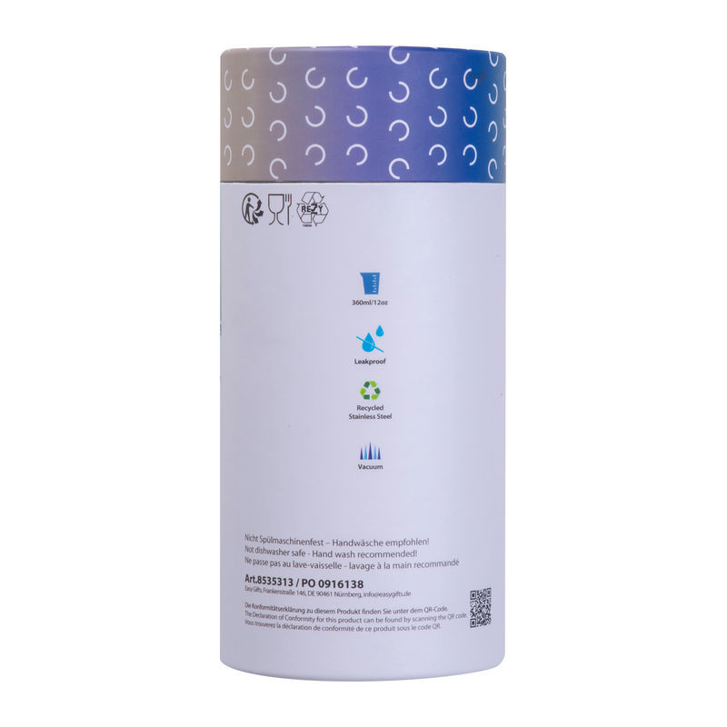 Stílusos pohár újrahasznosított rozsdamentes acélból, duplafalú vákuumszigeteléssel. Órákig tartja a hőt, ideális útközben. Modern színekben és kompakt kivitelben a mindennapi használathoz.