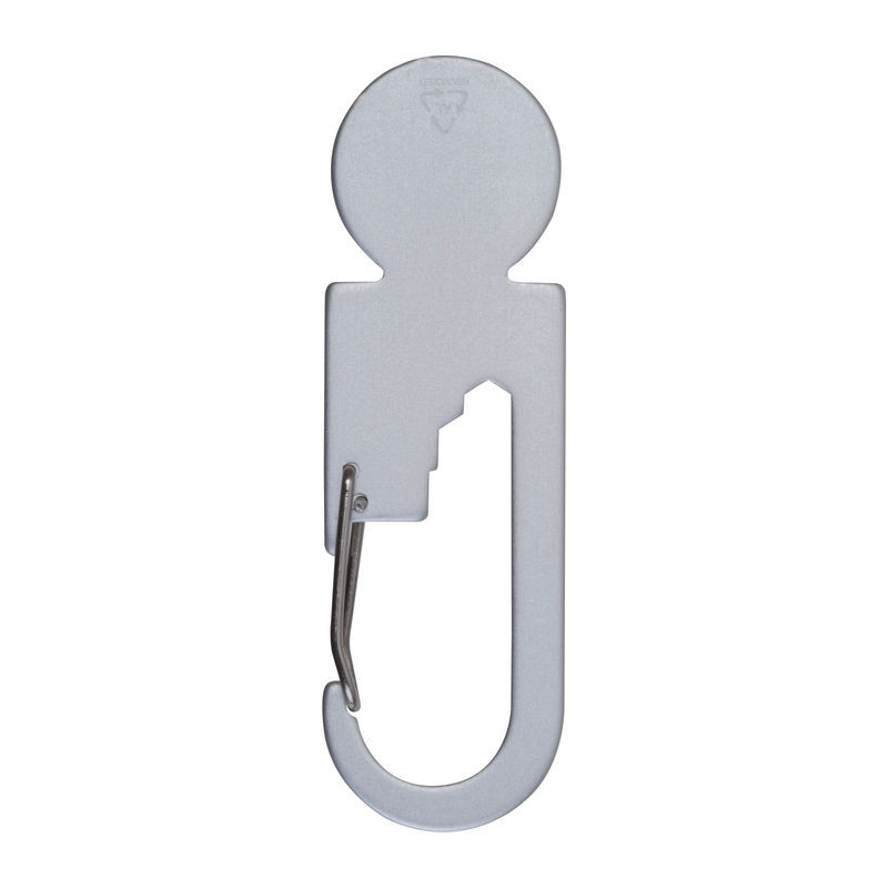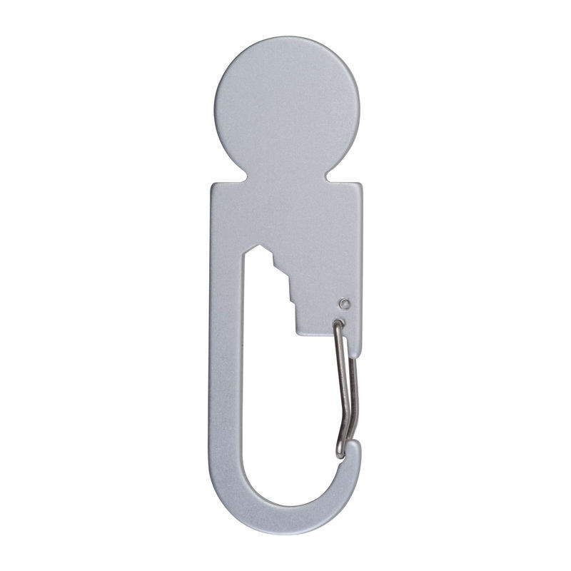 Alumíniumból készült többfunkciós szerszám, amely bevásárlókocsi-érmét, három különböző méretű imbuszkulcsot és egy karabinert tartalmaz.