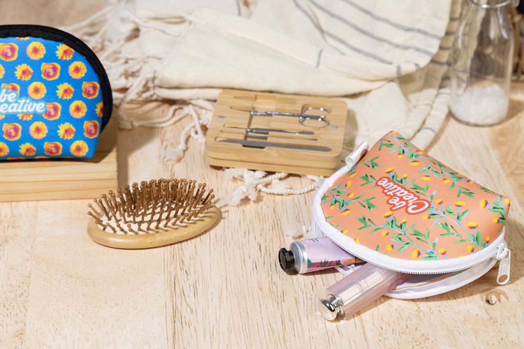 Egyedi gyártású, cipzáras kozmetikai táska RPET neoprénből. Megkülönböztető RPET címkével és teljes felületén szublimációs nyomtatott grafikával. Minimális rendelési mennyiség: 50 db.