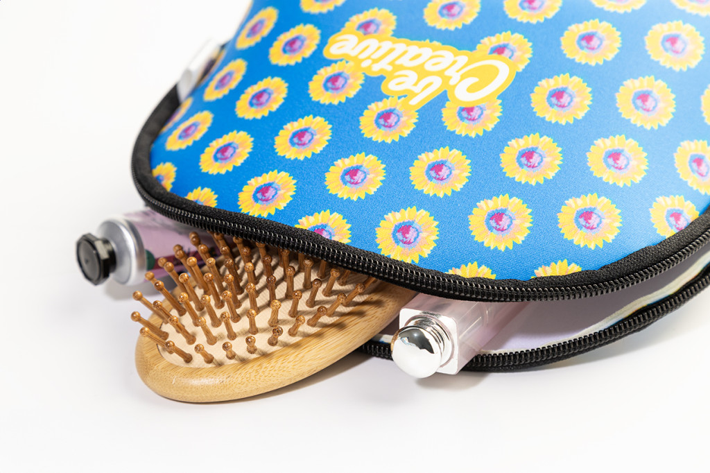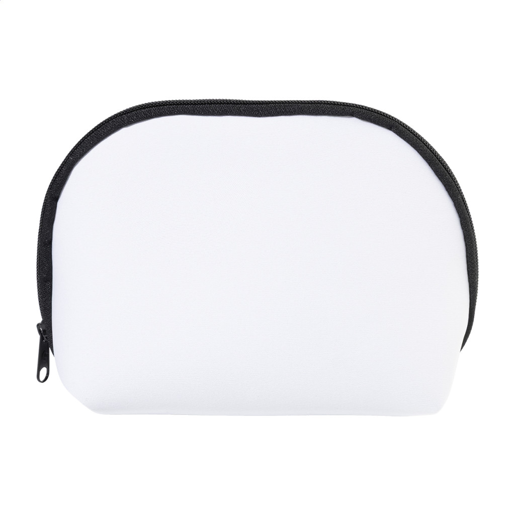 Egyedi gyártású, cipzáras kozmetikai táska RPET neoprénből. Megkülönböztető RPET címkével és teljes felületén szublimációs nyomtatott grafikával. Minimális rendelési mennyiség: 50 db.