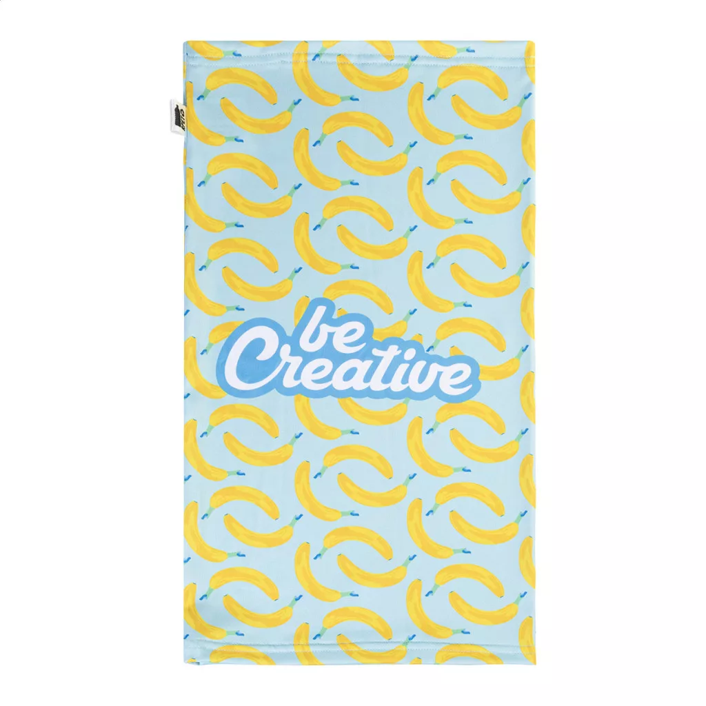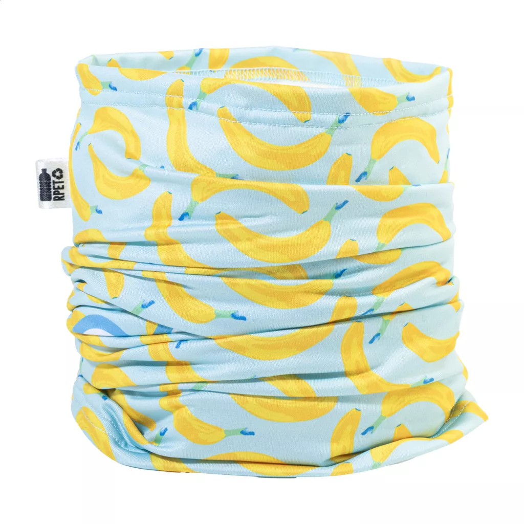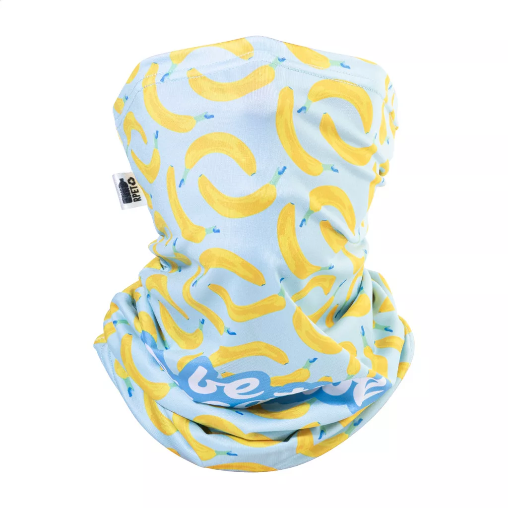 Egyedi gyártású, multifunkciós RPET sál, teljes felületén szublimációs nyomtatott grafikával. 92% RPET poliészter és 8% elasztán (185 g/m²), megkülönböztető RPET címkével. Minimális rendelési mennyiség: 50 db.