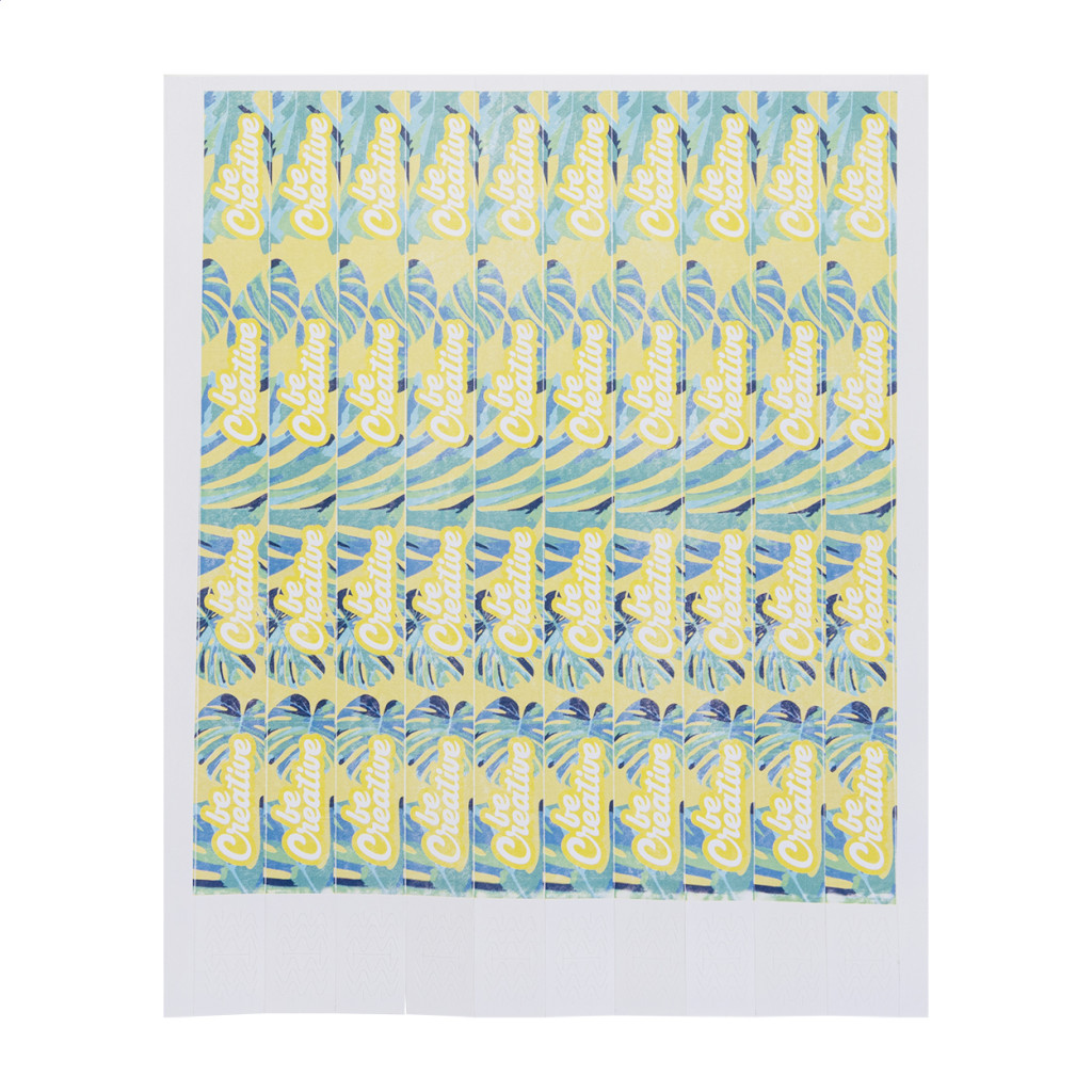 Egy ív full-colour nyomtatású, 19 mm széles tyvek karszalag (10 db), öntapadós biztonsági zárral és egyedi számozással. Az ár tartalmazza az elülső oldal digitális nyomtatását. Minimális rendelési mennyiség: 50 db (500 karszalag).