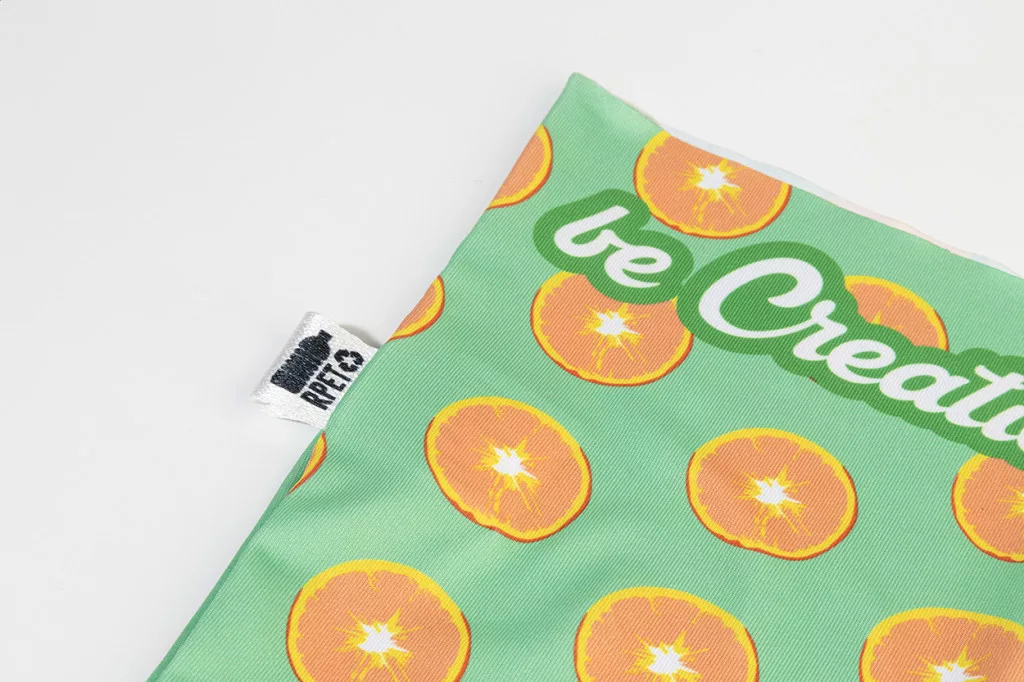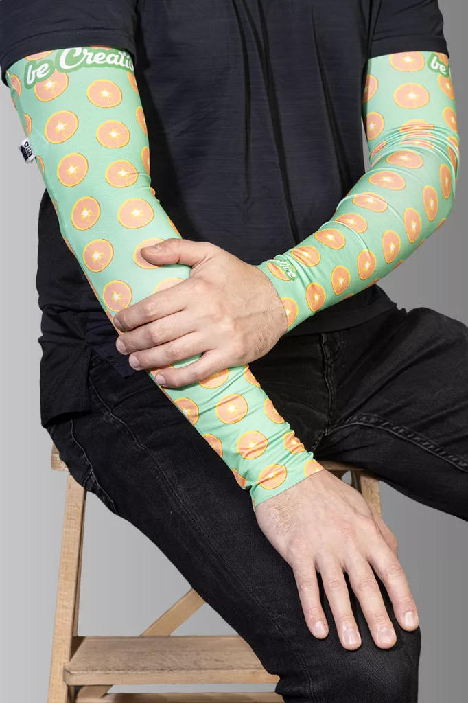 Egy pár egyedi gyártású, rugalmas RPET karvédő, teljes felületén szublimációs nyomtatott grafikával. 92% RPET poliészter és 8% elasztán (185 g/m²), megkülönböztető RPET címkével. Minimális rendelési mennyiség: 50 db. Méretek: M (8×12×48 cm), L (9,5×13,5×52 cm).
