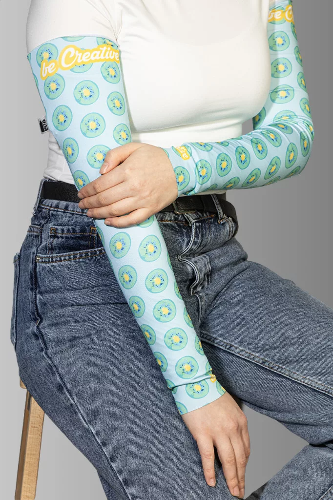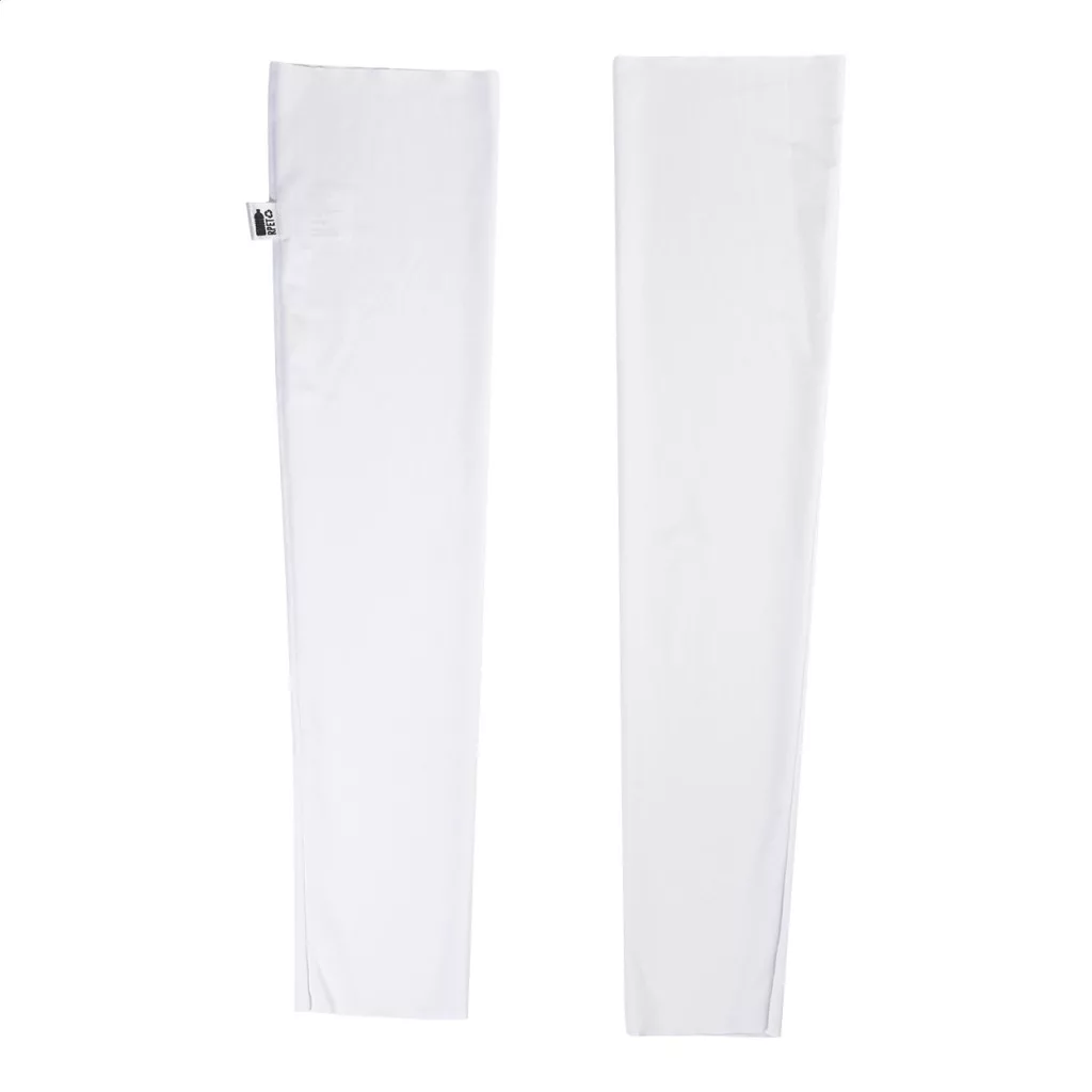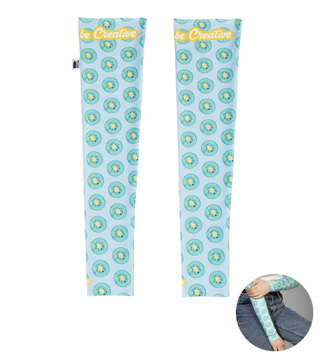 Egy pár egyedi gyártású, rugalmas RPET karvédő, teljes felületén szublimációs nyomtatott grafikával. 92% RPET poliészter és 8% elasztán (185 g/m²), megkülönböztető RPET címkével. Minimális rendelési mennyiség: 50 db. Méretek: M (8×12×48 cm), L (9,5×13,5×52 cm).