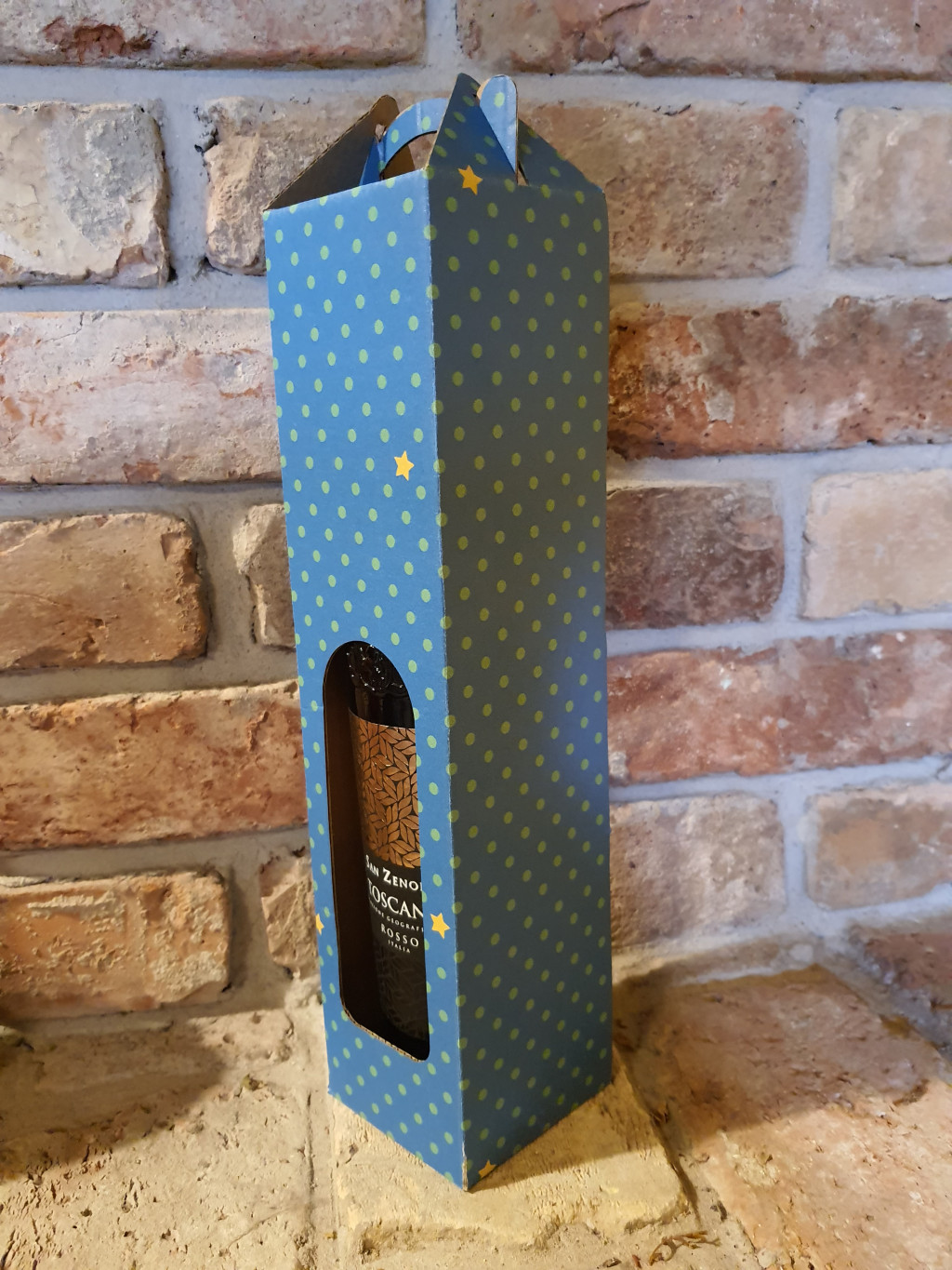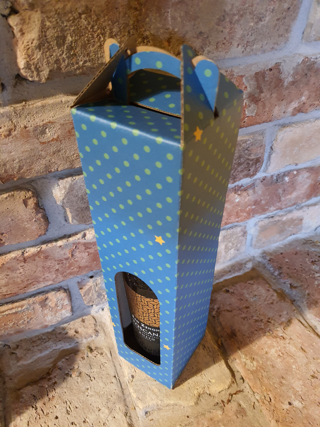 Egyedi gyártású, hullámkartonból készült hordozható füles doboz 1 db 0,75 l-es borosüveghez. A termék ára tartalmazza a full colour nyomtatás költségét. Lapraszerelten, bor nélkül szállítjuk. Minimális rendelési mennyiség: 50 db.
