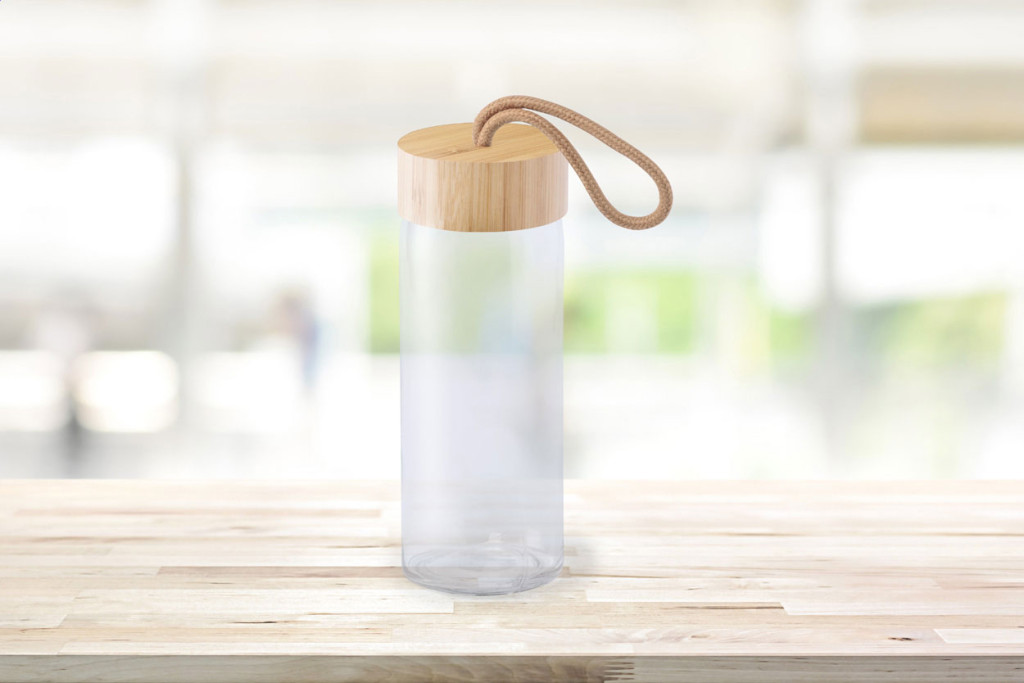 Üveg sportkulacs bambusz kupakkal, 430 ml. Ajándékdobozban szállítjuk.