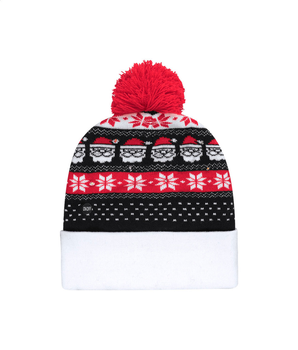 Kötött karácsonyi téli sapka akrilból, pom-pommal, 6 LED-del és 3 fény móddal. Gombelemmel szállítjuk.