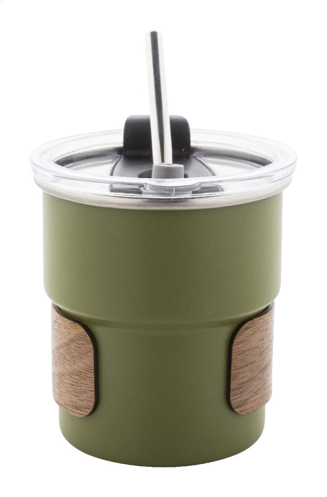 Egyfalú, újrahasznosított rozsdamentes acél utazópohár diófa markolattal, műanyag ivófedéllel és újrahasznosított rozsdamentes acél szívószállal. 260 ml.