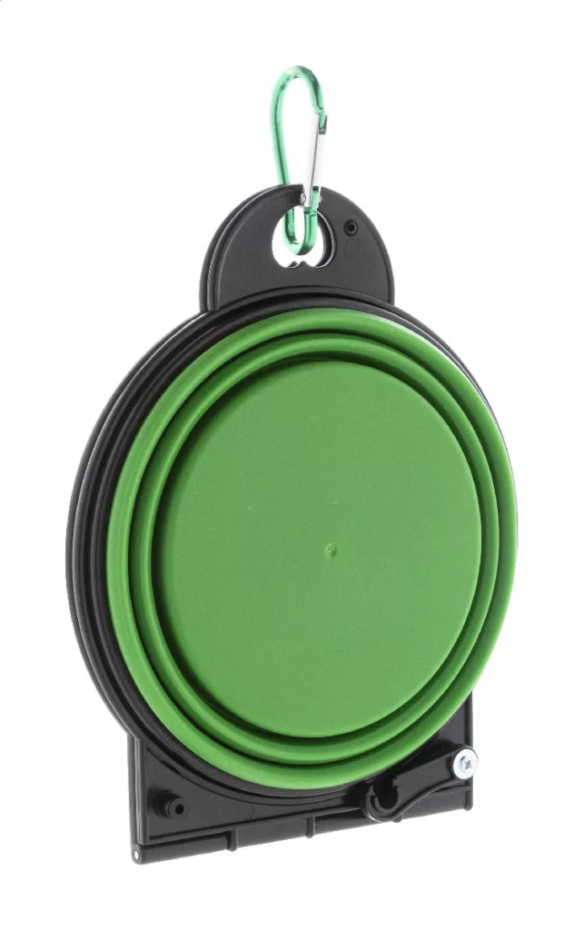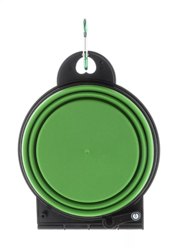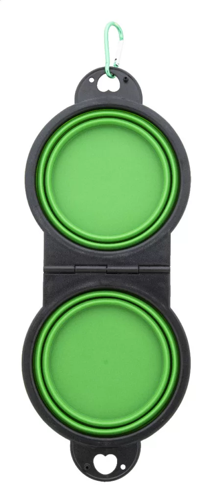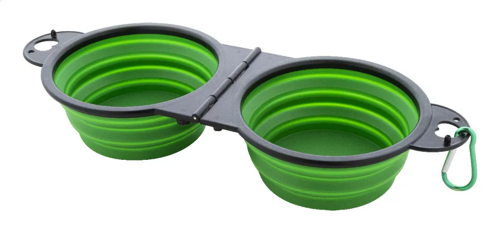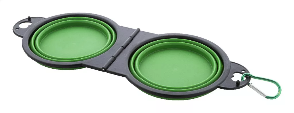 Összecsukható kutyatál TPE-ből, két 450 ml-es rekesszel és hozzá illő színű alumínium karabinerrel.