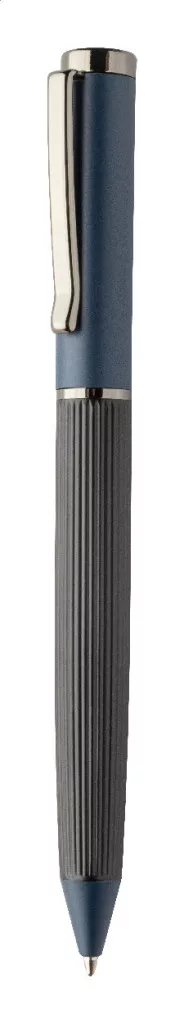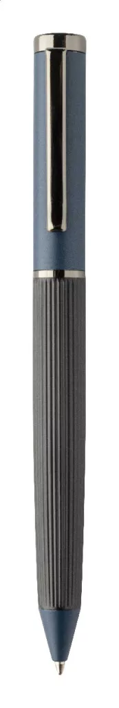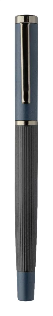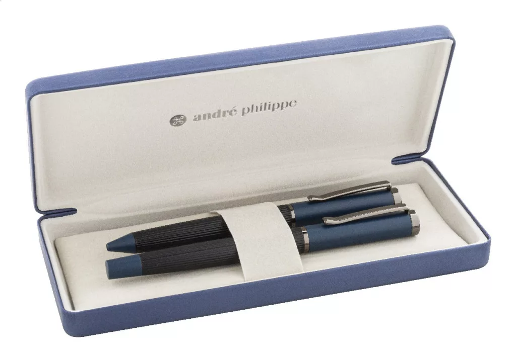 Elegáns, fém golyóstoll és rollertoll szett csíkos testtel, színes díszítőelemekkel és fényes fegyverfém részletekkel. Színben hozzáillő ajándékdobozban, kék tollbetéttel. André Philippe márkatermék.