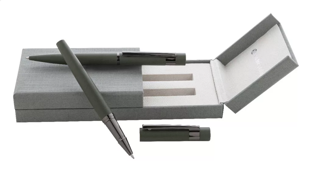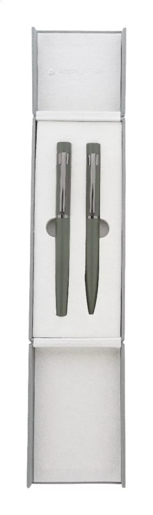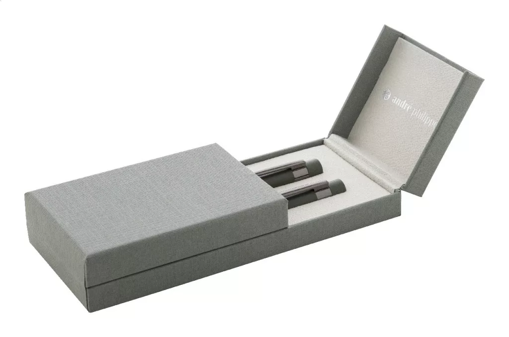 Elegáns, fém golyóstoll és rollertoll szett fényes fegyverfém részletekkel. Színben hozzáillő ajándékdobozban, kék tollbetéttel. André Philippe márkatermék.