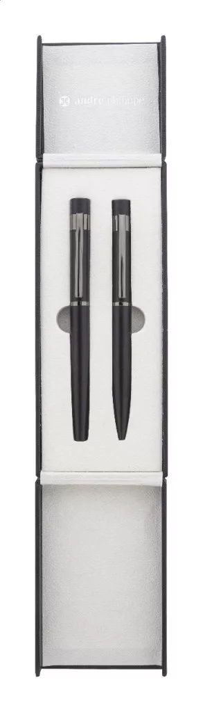 Elegáns, fém golyóstoll és rollertoll szett fényes fegyverfém részletekkel. Színben hozzáillő ajándékdobozban, kék tollbetéttel. André Philippe márkatermék.