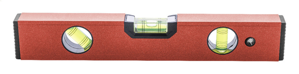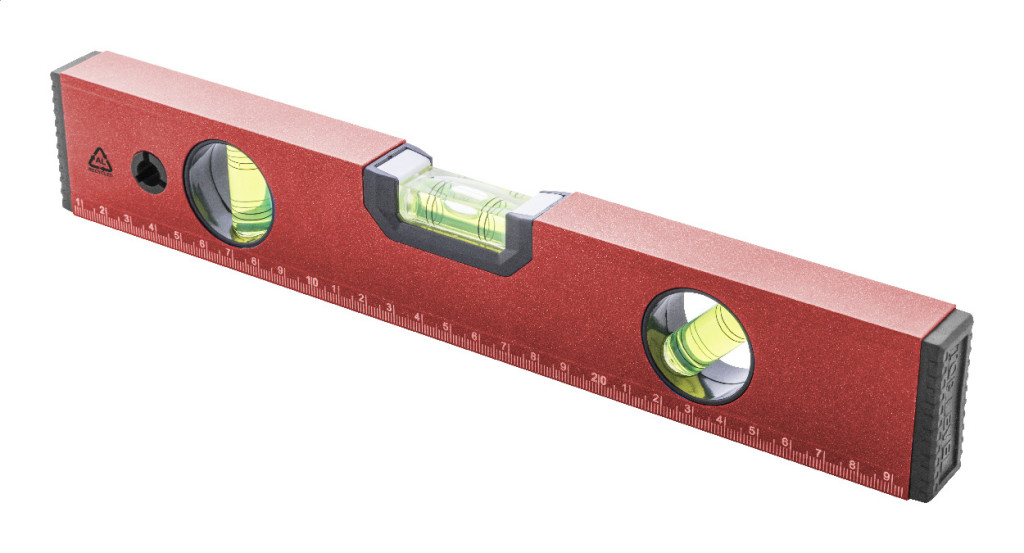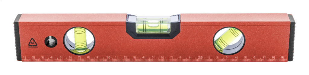 Mágneses vízmérték újrahasznosított alumíniumból, három vízmértékkel (vízszintes, függőleges és 45°-os) és 30 cm-es vonalzóval.