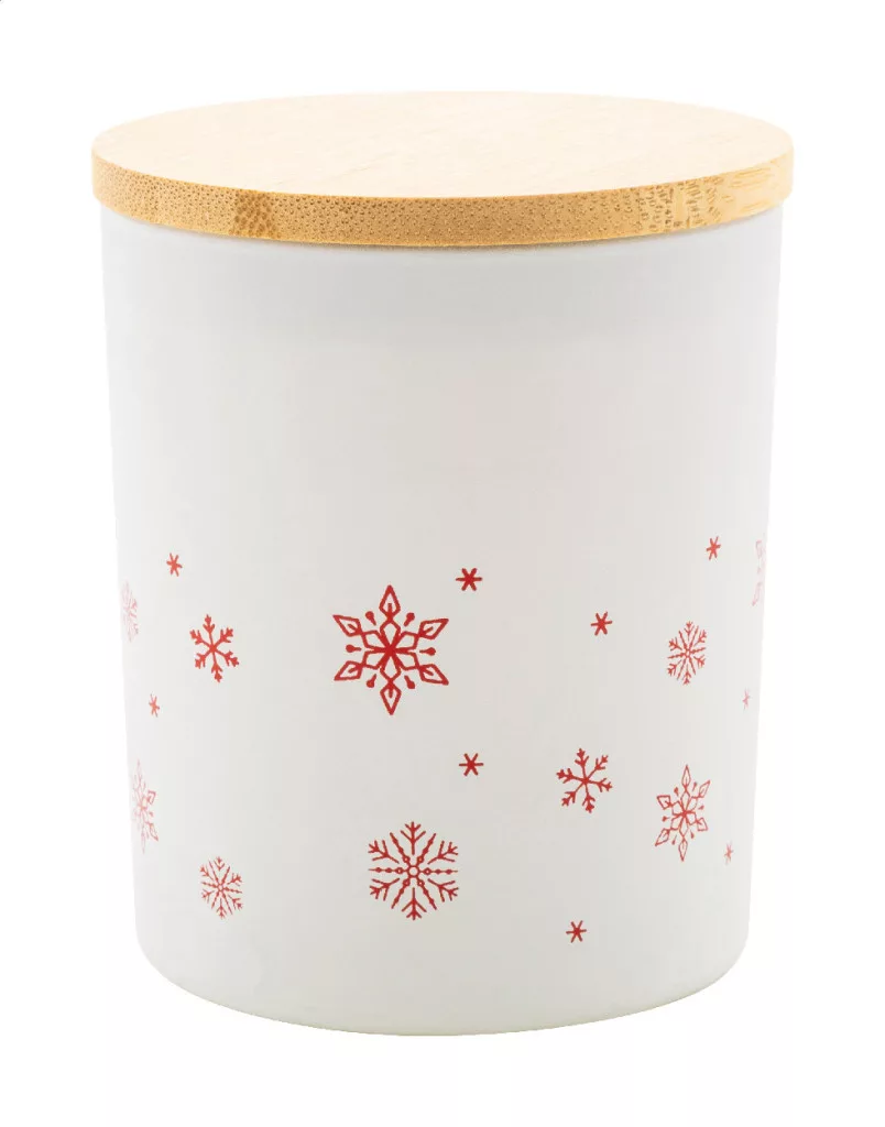 Növényi alapú illatosított viaszgyertya homokfúvott üveg tartóban, karácsonyi hópehely díszítéssel és bambusz fedéllel. 120 gramm viasszal. Kraft papír dobozban.