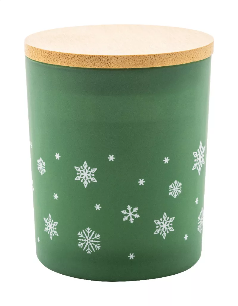 Növényi alapú illatosított viaszgyertya homokfúvott üveg tartóban, karácsonyi hópehely díszítéssel és bambusz fedéllel. 120 gramm viasszal. Kraft papír dobozban.