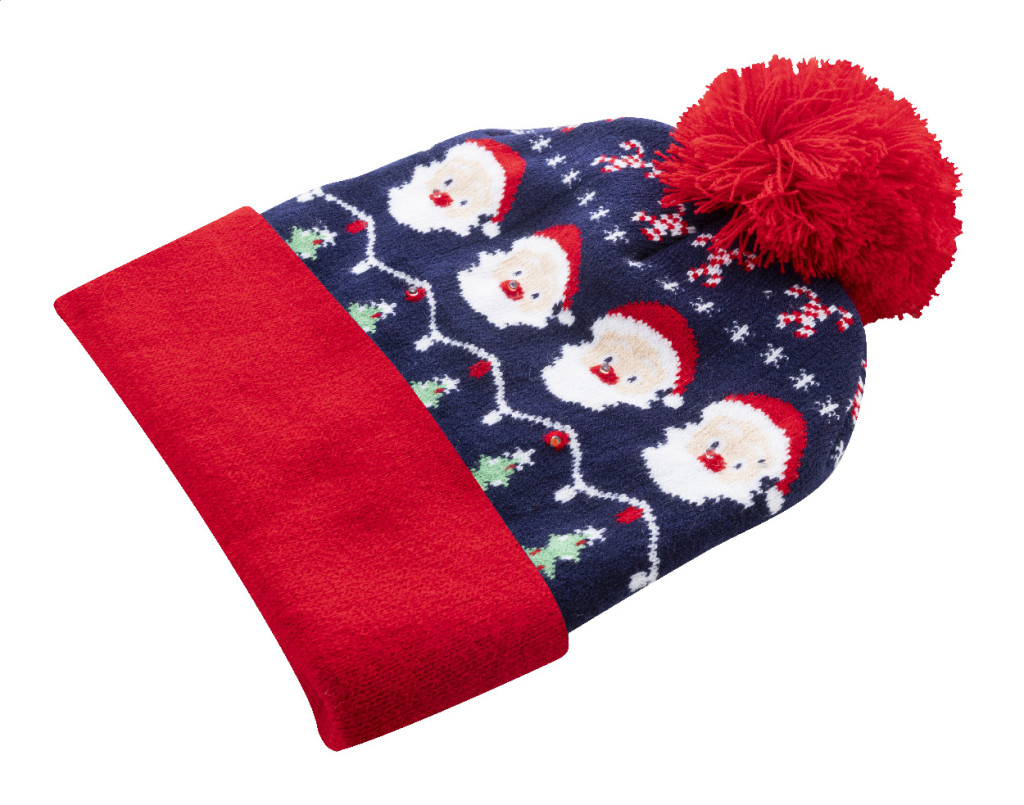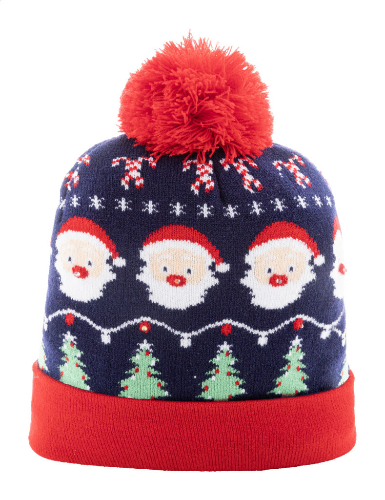 Kötött karácsonyi sapka akrilból, 6 LED fénnyel (3 világítási mód), mandzsettával és bojttal. Gombelemmel szállítjuk.