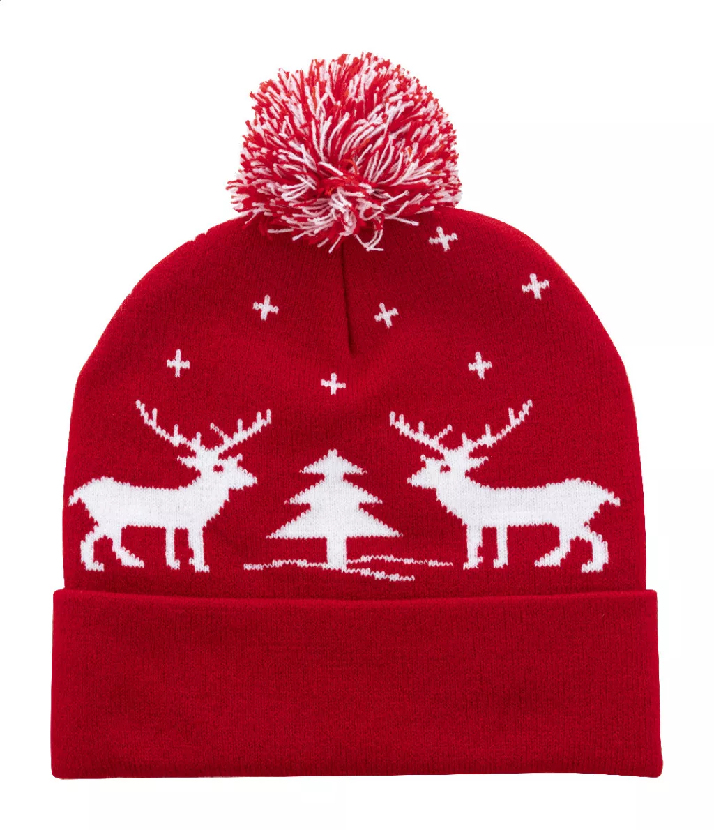 Kötött karácsonyi sapka akrilból, mandzsettával és bojttal.