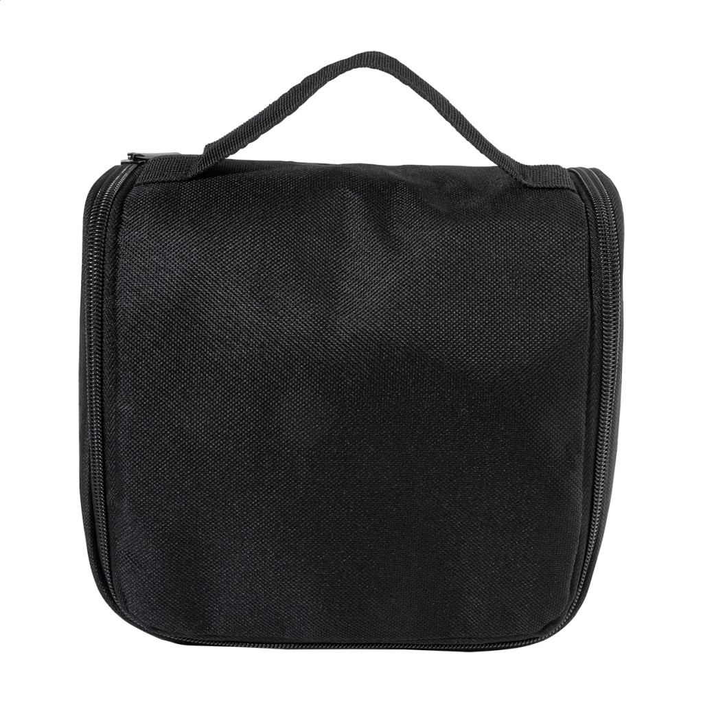 Akasztós RPET kozmetikai táska cipzáras belső rekeszekkel és hálós zsebekkel. 600D RPET poliészterből, megkülönböztető RPET címkével.