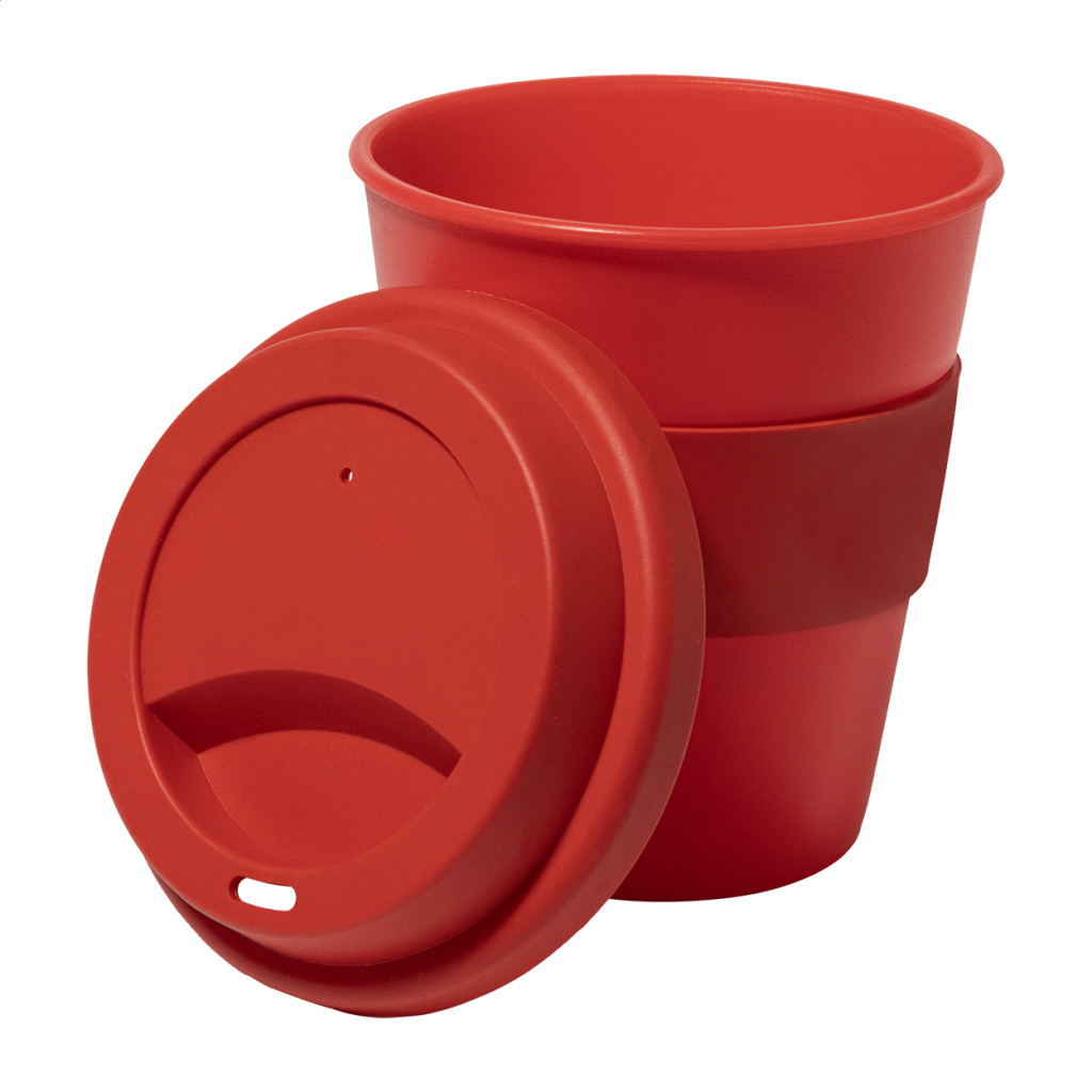 Egyfalú, PP műanyag utazópohár TPE ivófedéllel és markolattal. 350 ml.