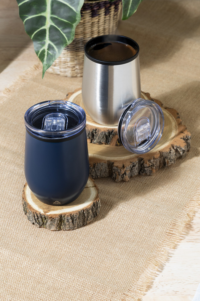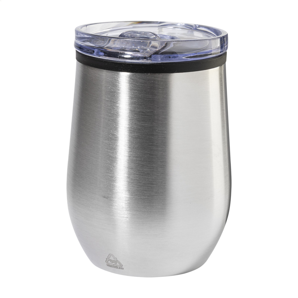 Duplafalú, újrahasznosított rozsdamentes acél thermo pohár PP belső résszel és PS ivófedéllel. 350 ml.