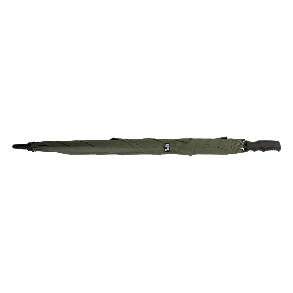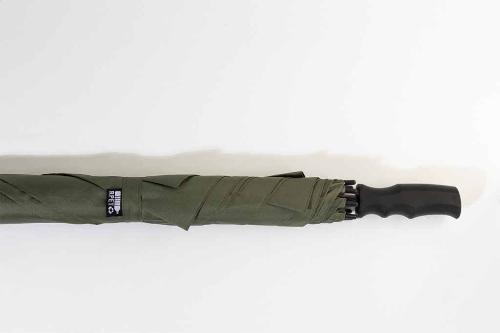 Nagy méretű, automatikus, szélálló, szögletes esernyő teljes üvegszálas szárral és vázzal, gumírozott ABS fogantyúval. 190T RPET pongee. Megkülönböztető RPET címkével.