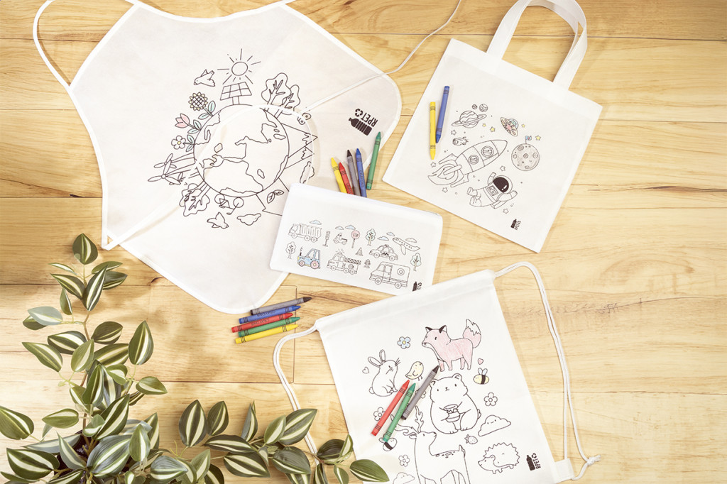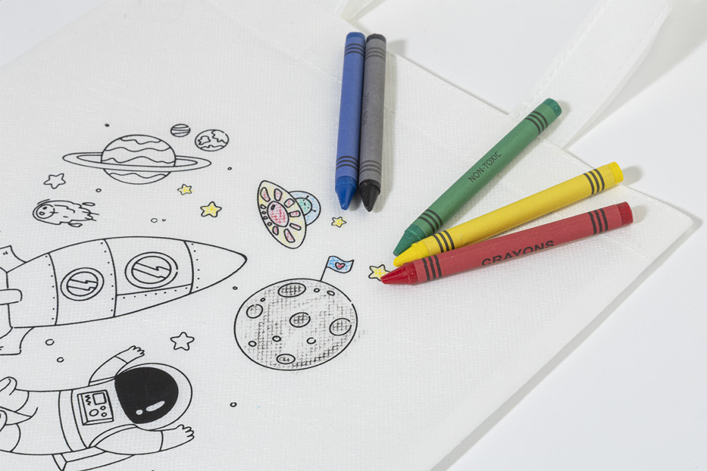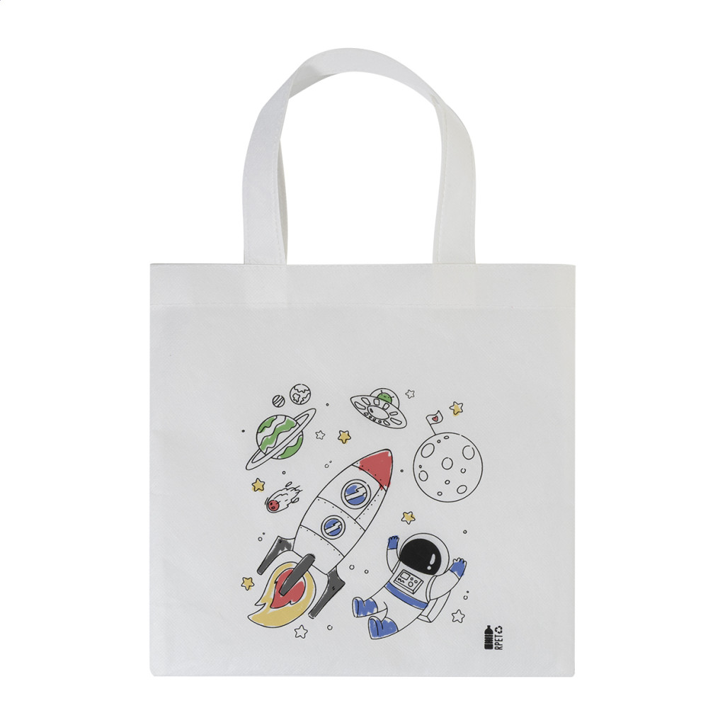 RPET non-woven anyagú, színezhető mini bevásárlótáska gyerekeknek 5 zsírkrétával.