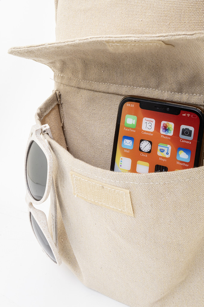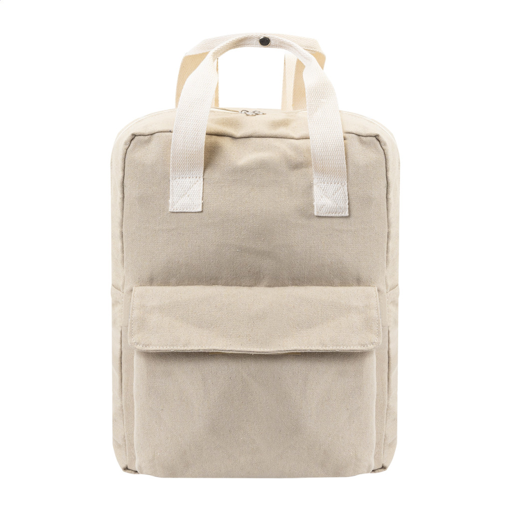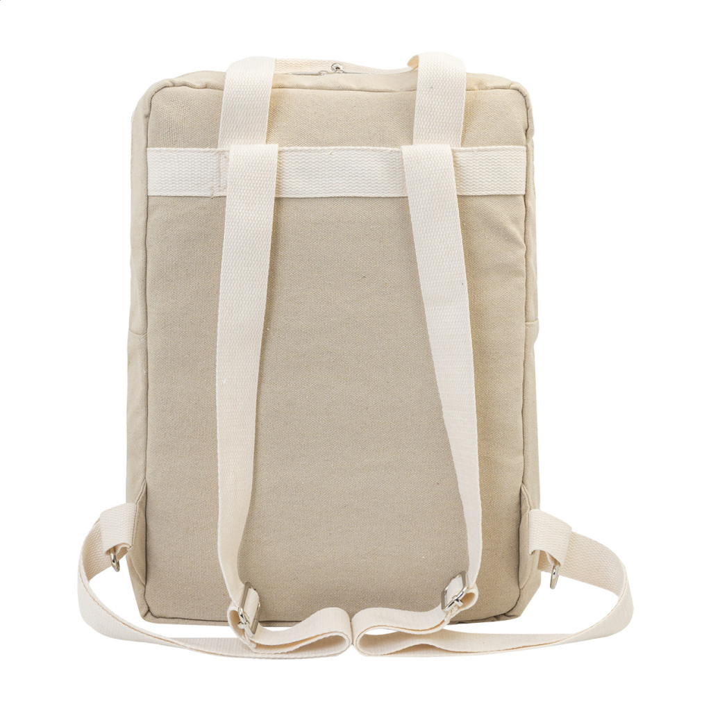 Újrahasznosított vászon hátizsák cipzáras fő rekesszel, párnázott laptop rekesszel (13") és tépőzáras elülső zsebbel. 70% újrahasznosított pamut és 30% RPET poliészter. Megkülönböztető újrahasznosított pamut címkével.