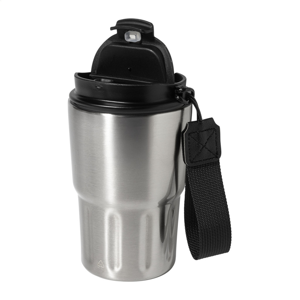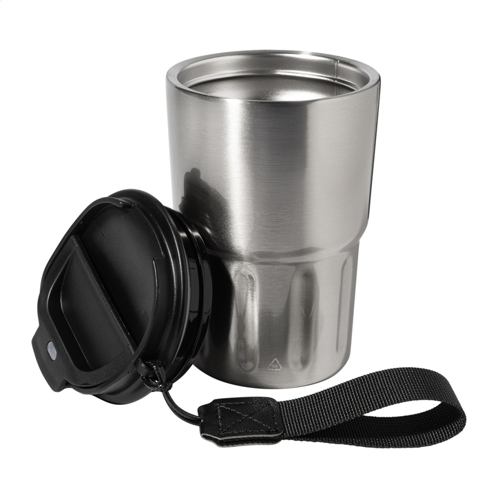 Duplafalú, újrahasznosított rozsdamentes acélból készült, hőszigetelt thermo pohár PP ivófedéllel. RPET poliészter hordpánttal. 350 ml.