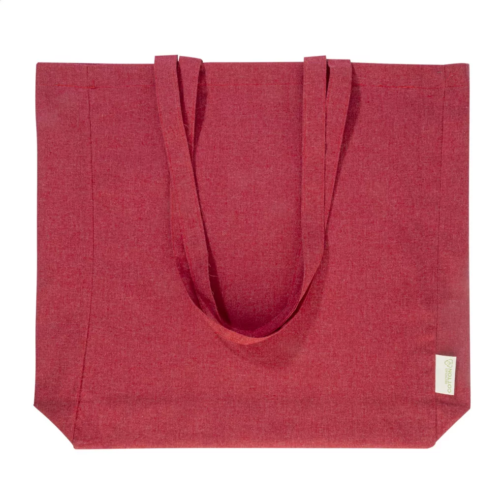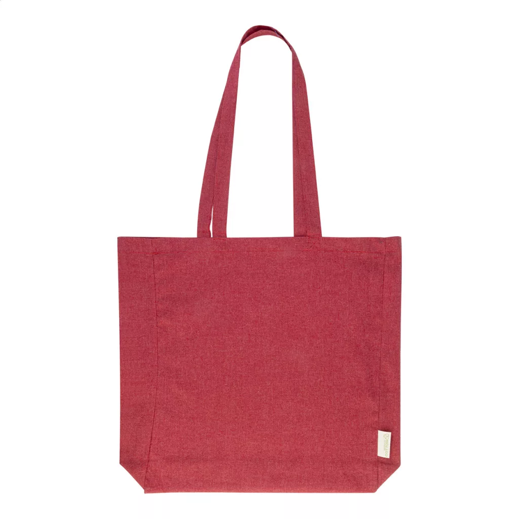 Bevásárlótáska betoldással és hosszú fülekkel, 70% újrahasznosított pamutból és 30% RPET poliészterből, 140 g/m². Megkülönböztető újrahasznosított pamut címkével.