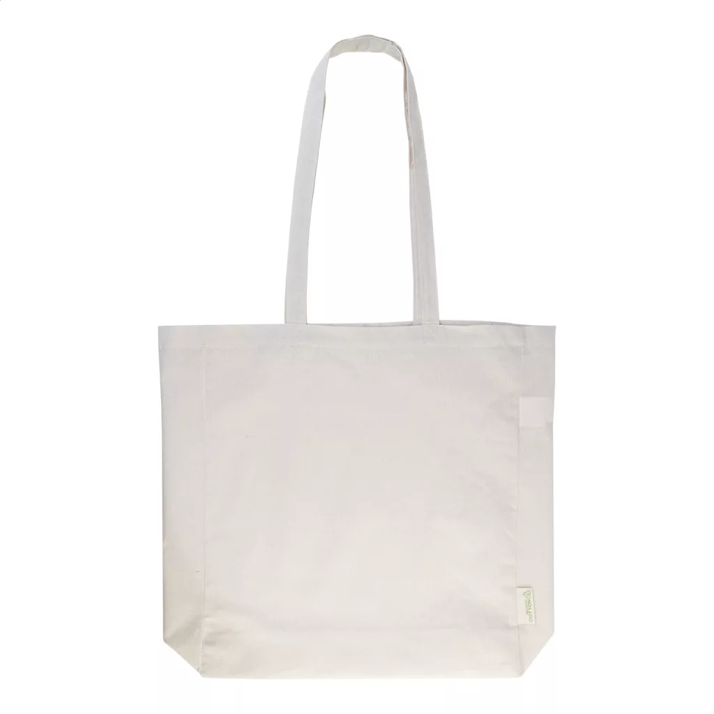 Bevásárlótáska betoldással és hosszú fülekkel, 70% újrahasznosított pamutból és 30% RPET poliészterből, 140 g/m². Megkülönböztető újrahasznosított pamut címkével.
