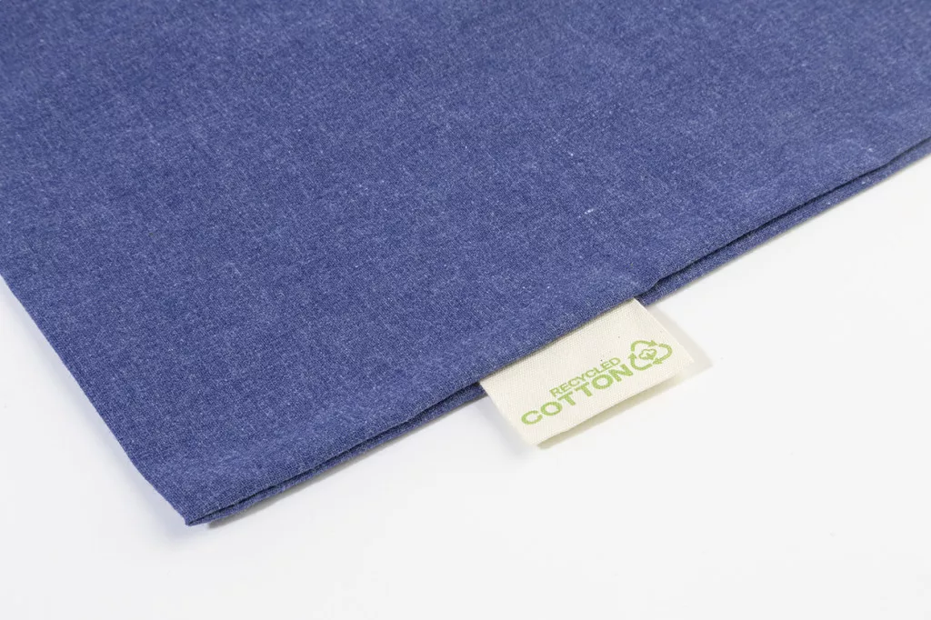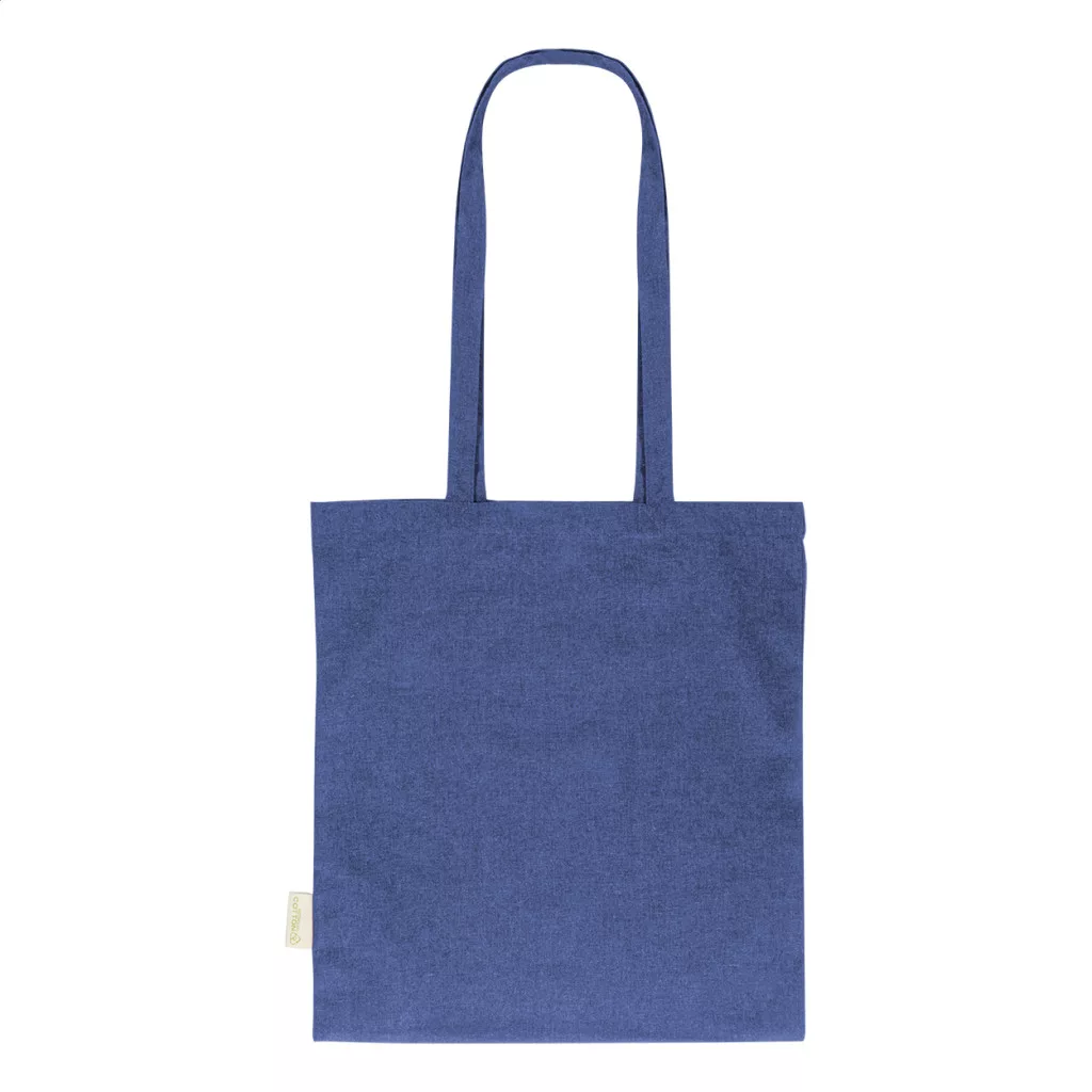 Bevásárlótáska hosszú fülekkel, 70% újrahasznosított pamutból és 30% RPET poliészterből, 140 g/m². Megkülönböztető újrahasznosított pamut címkével.