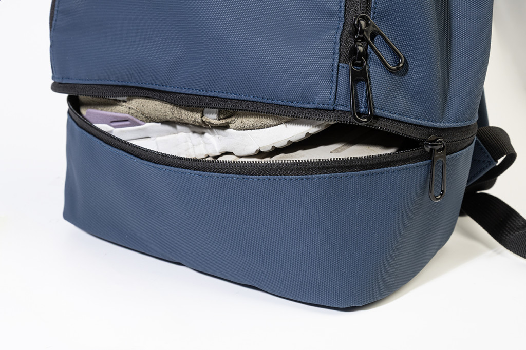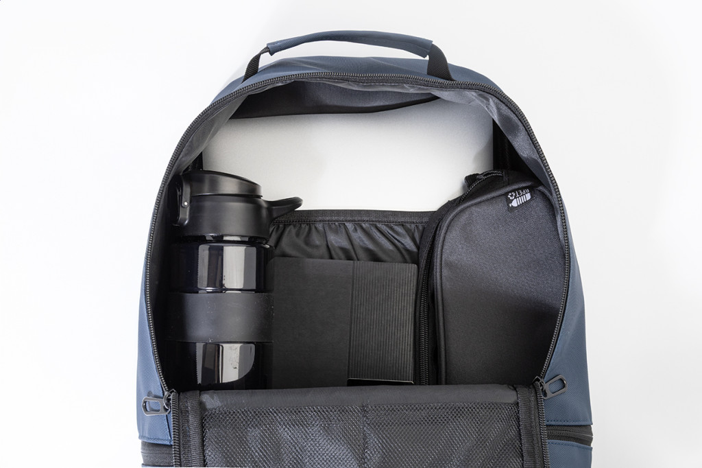 Vízálló RPET hátizsák cipzáras fő rekesszel, párnázott laptop rekesszel (13"), cipzáras alsó rekesszel és rejtett oldalsó zsebbel. Párnázott hátrésszel és vállpántokkal. PU bevonatú 600D RPET poliészterből, megkülönböztető RPET címkével.