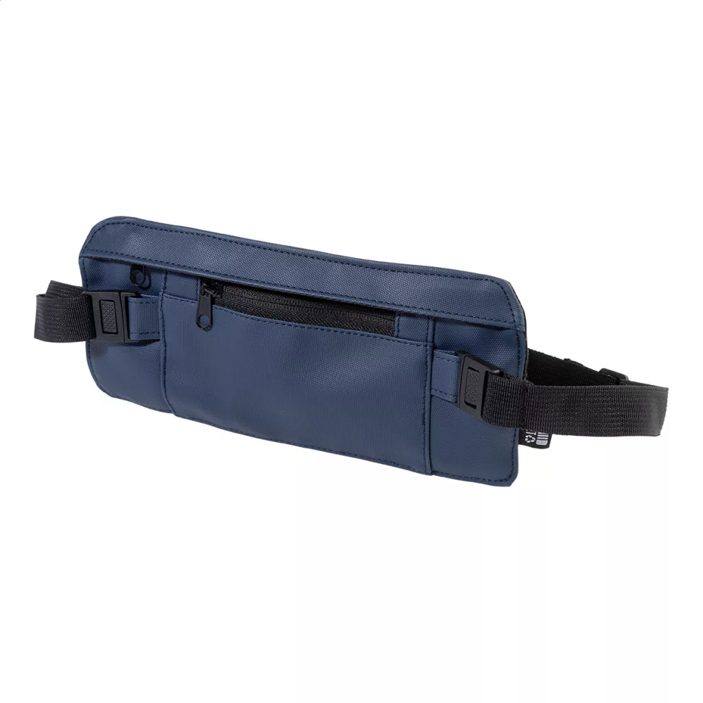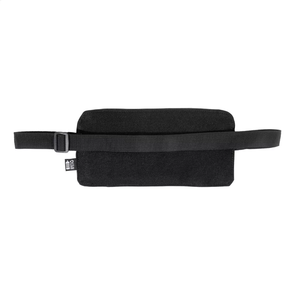 Keskeny RPET övtáska PU bevonatú elülső oldallal, cipzáras rekesszel és elülső zsebbel, állítható pánttal. PU bevonatú 600D RPET poliészterből, megkülönböztető RPET címkével.
