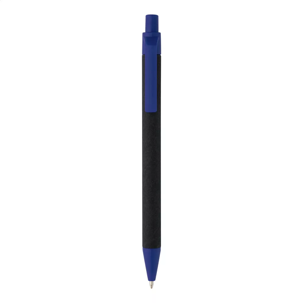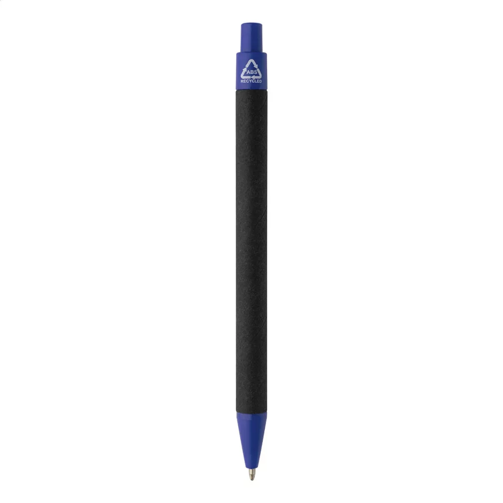 Újrahasznosított papírból készült golyóstoll fekete testtel és újrahasznosított ABS alkatrészekkel. Kék tollbetéttel.