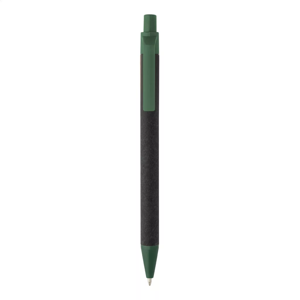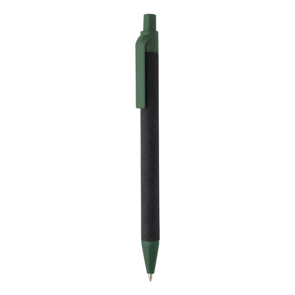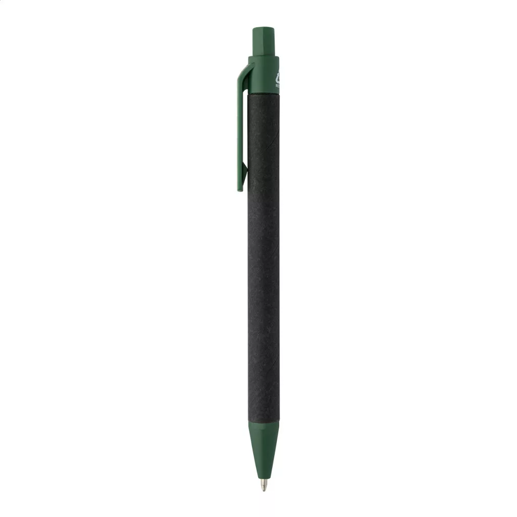 Újrahasznosított papírból készült golyóstoll fekete testtel és újrahasznosított ABS alkatrészekkel. Kék tollbetéttel.