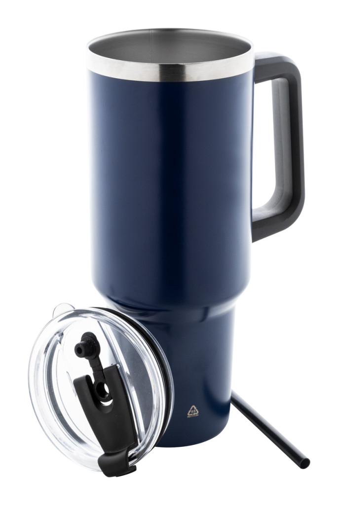 Duplafalú, újrahasznosított rozsdamentes acélból készült vákuumszigetelt thermo bögre PS ivófedéllel és PP szívószállal. 1200 ml.