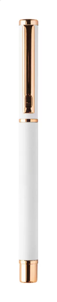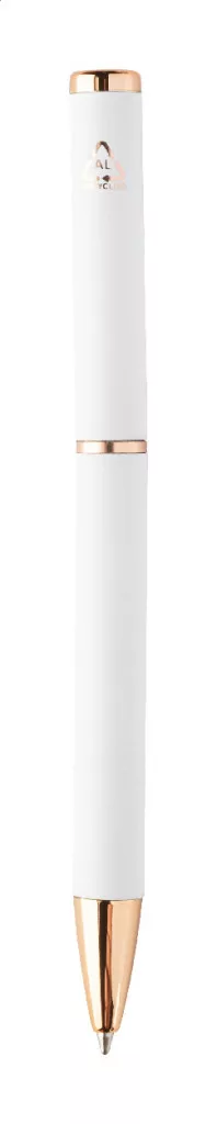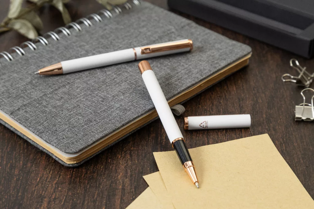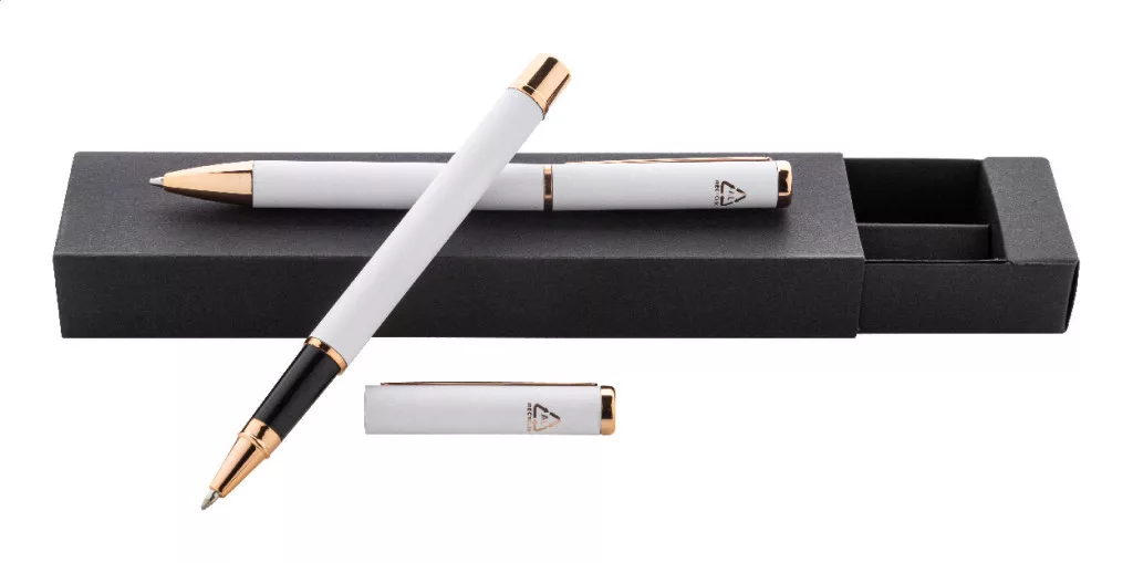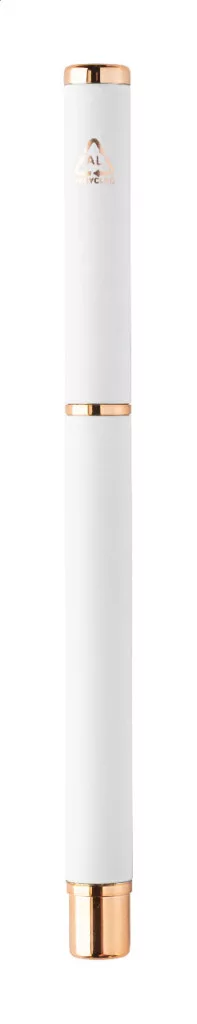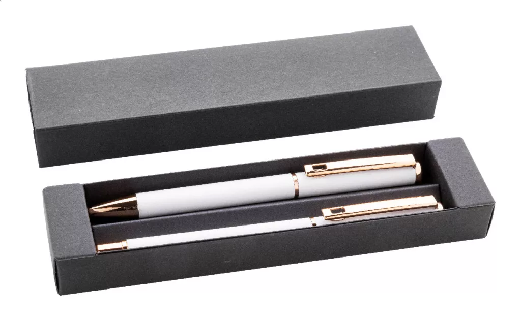 Újrahasznosított alumínium tollszett golyóstollal és rollertollal, gumírozott felülettel és rózsaarany részletekkel. Kék tollbetéttel. Speciális bevonattal a tükörlézeres gravírozáshoz rózsaarany színben. Fekete papír ajándékdobozban.