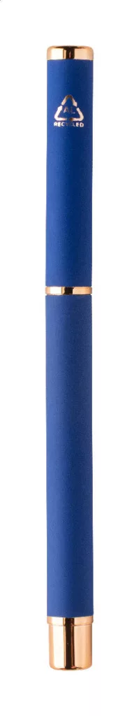 Újrahasznosított alumínium tollszett golyóstollal és rollertollal, gumírozott felülettel és rózsaarany részletekkel. Kék tollbetéttel. Speciális bevonattal a tükörlézeres gravírozáshoz rózsaarany színben. Fekete papír ajándékdobozban.