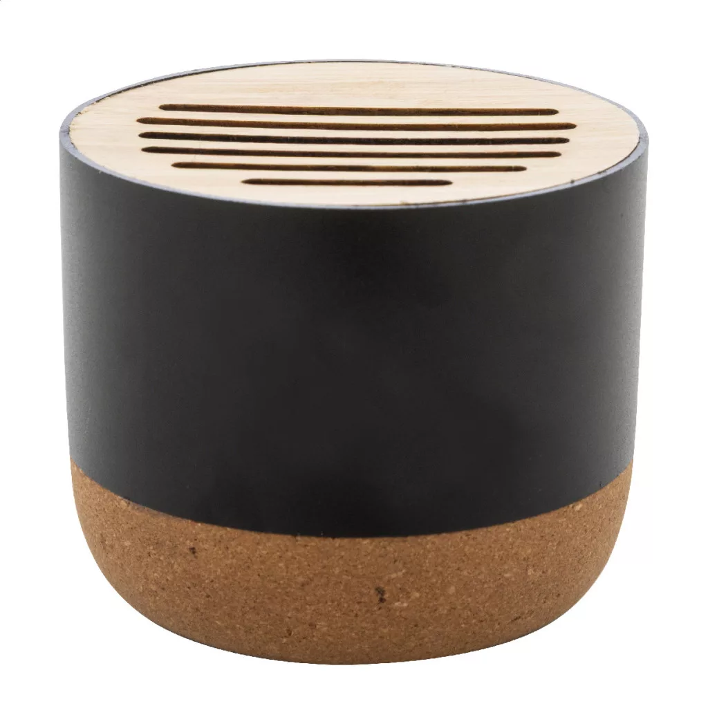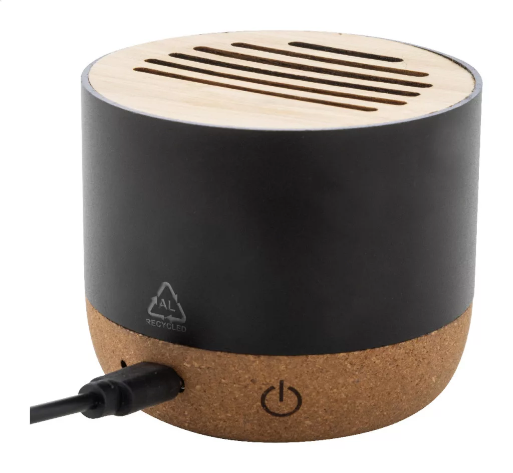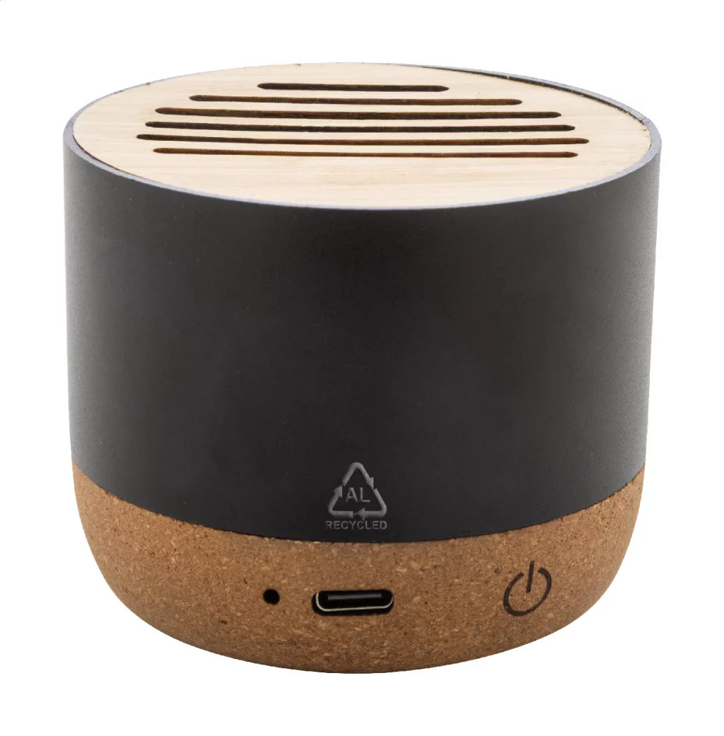 Vezeték nélküli hangszóró újrahasznosított alumínium házban, bambuszhálóval és természetes parafa talppal. Újratölthető akkumulátorral (400 mAh). USB töltőkábellel.