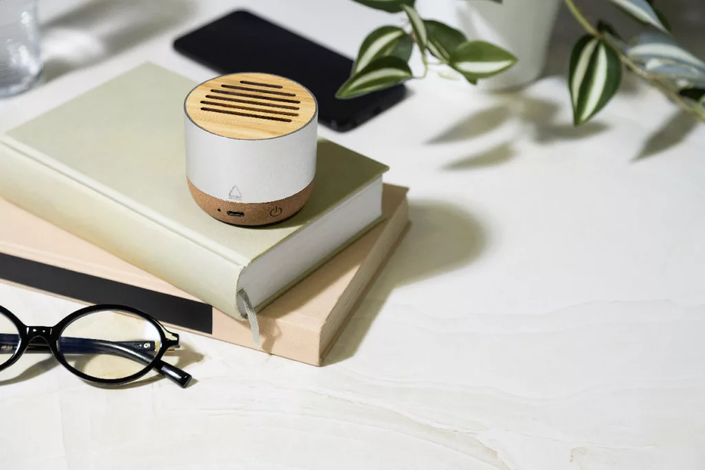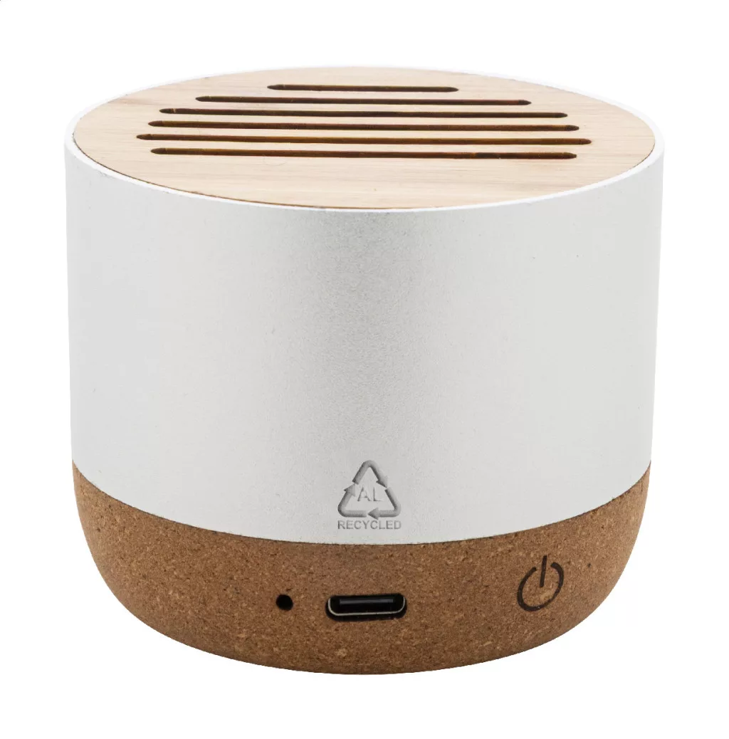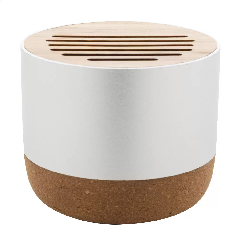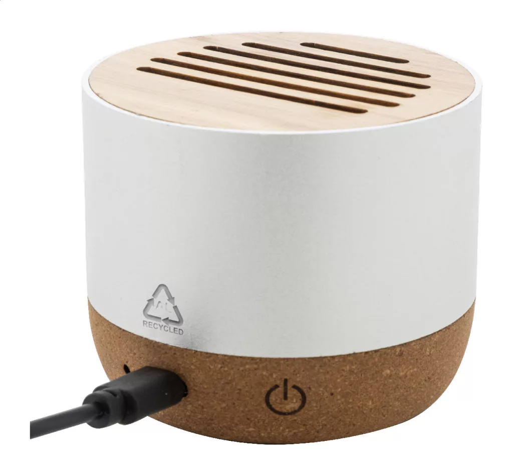 Vezeték nélküli hangszóró újrahasznosított alumínium házban, bambuszhálóval és természetes parafa talppal. Újratölthető akkumulátorral (400 mAh). USB töltőkábellel.