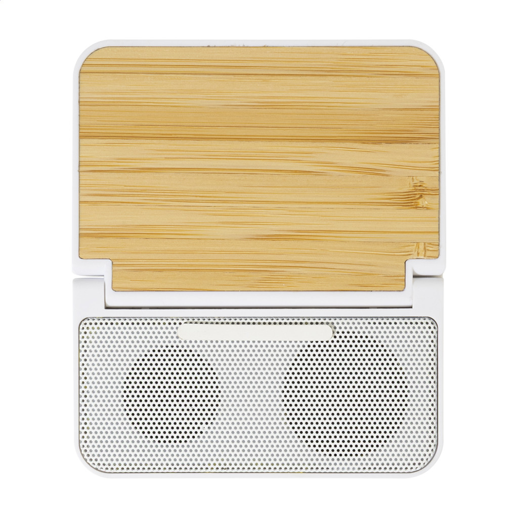 Újrahasznosított ABS vezeték nélküli hangszóró bambusz borítású mobiltartóval és beépített vezeték nélküli gyorstöltővel (15W). Beépített újratölthető akkumulátorral (1200 mAh). USB töltőkábellel.