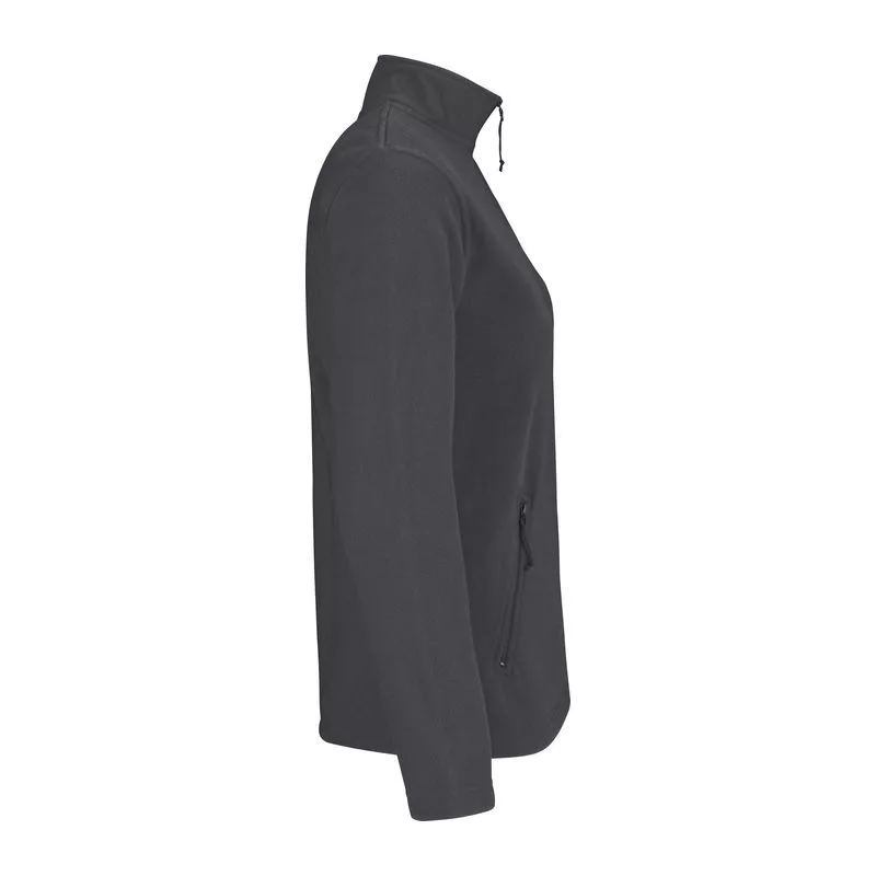 Modern megjelenésű, teljesen cipzárazható, mikró szálas polár női pulóver, 2 cipzáras zsebbel az elején, megerősített nyakrésszel.